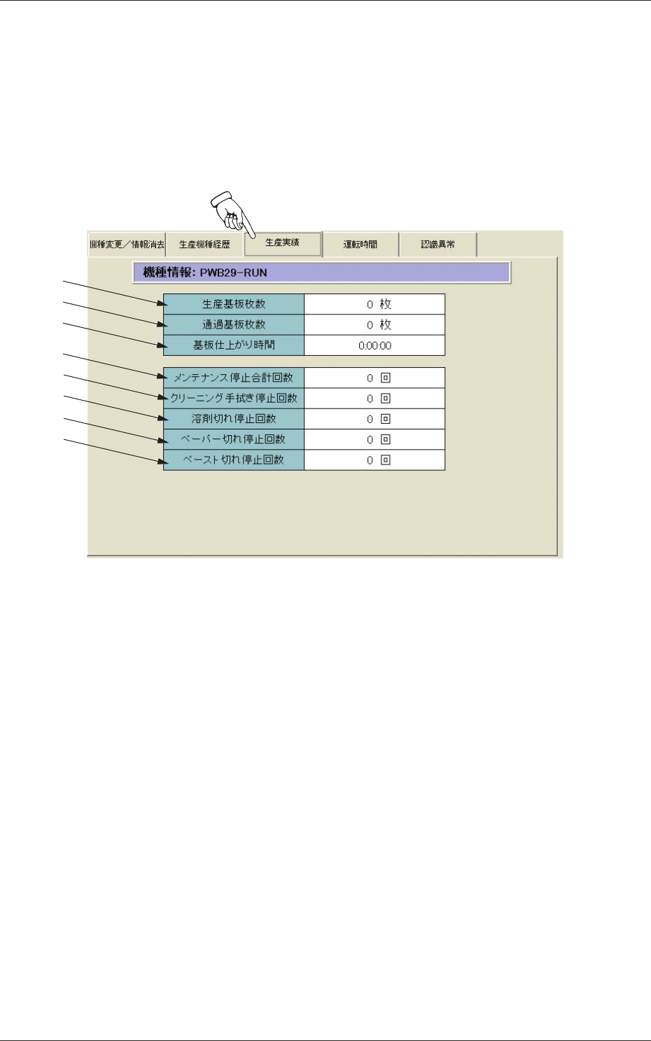 ” サブメニュー画面の [ 生産実績 ] タブを押す