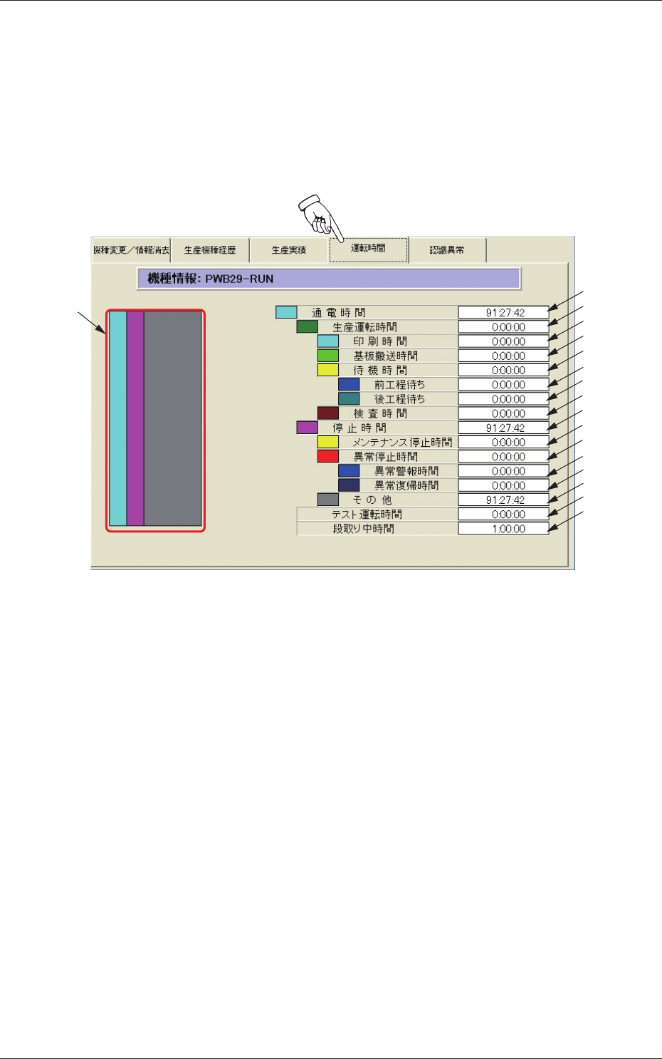 3 - 20 Tg 1299 -ID-PM 0602 - 001 3.4 “ 運転時間 ” タブ 3.4 “ 運転時間 ” タブ カレント機種の運転時間データが表示されます。 • シートの表示 “ 機種別稼動情報 ” サブメニュー画面の [ 運転時間 ] タブを押す と、以下のタブシートが表示されます。 [1] [2] [3] [4] [5] [6] [7] [8] [9] [10] [11] [12] [13] [14] [15] […