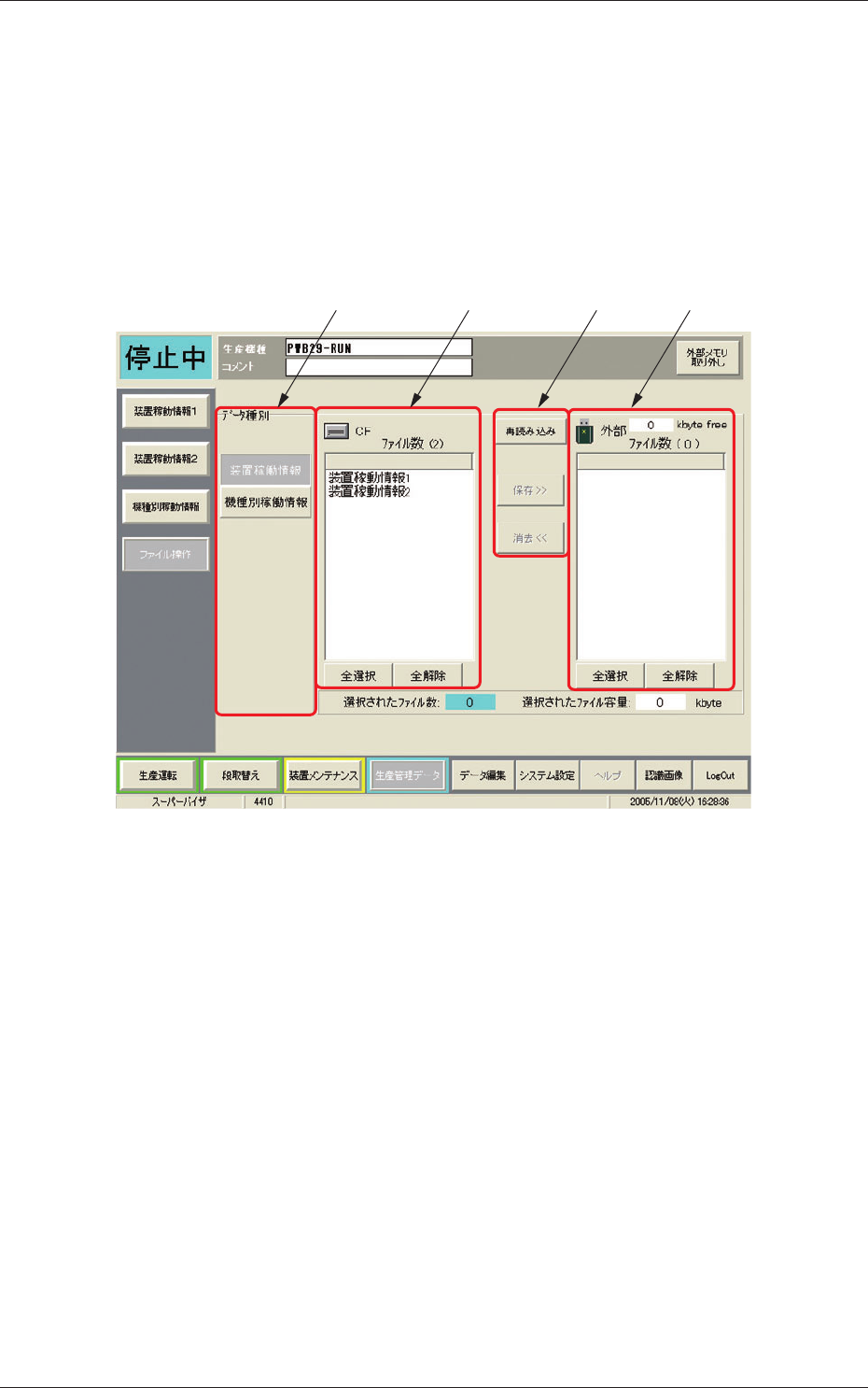 3 - 24 Tg 1299 -ID-PM 0602 - 001 4. “ ファイル操作 ” サブメニュー 4. “ ファイル操作 ” サブメニュー USB ポート (1.1) を使用して、 印刷データを USB メモリ ( 外部メモリ ) へ “ 保存 / 読み込み ” を行います。 • 画面の表示 生産管理データサブメニューバーの [ ファイル操作 ] ボタンを押す と、以下のサブメニュー画面が表示されます。 [1] [2] [3]…