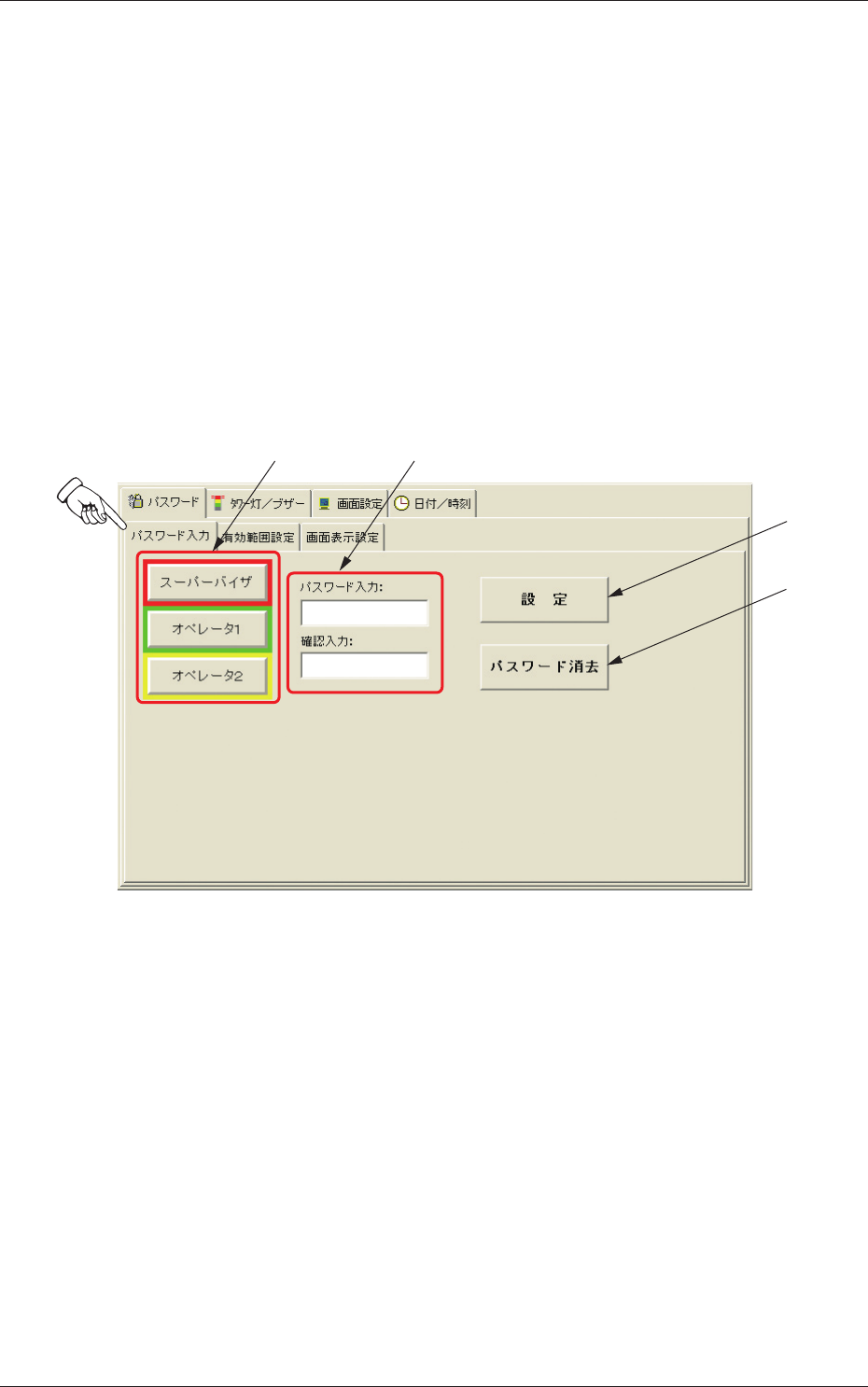 4-5 Tg1299-ID-PM 0602-001 2.1 “ パスワード ” タブ 2.1 “ パスワード ” タブ セキュリテイ確保のために、 装置を操作する担当者に対してパスワー ドを設定し、担当者ごとに装置の機能を設定する範囲を変えること ができます。 “ パ ス ワ ー ド ” タ ブ シ ー ト は 、 “ パ ス ワ ー ド 入 力 ” タ ブ シ ー ト お よ び “ 有 効範囲設定 ” タブシートで構成されます。 2…