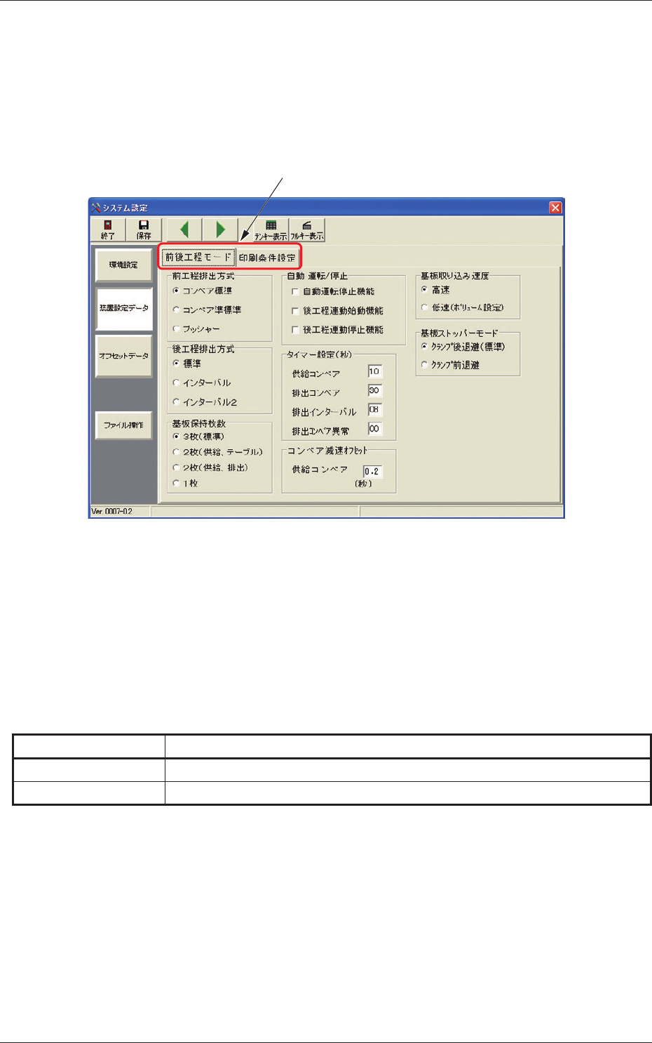 前後工程モード 主にインラインで生産を行う場合の各種データ設定を行います。
