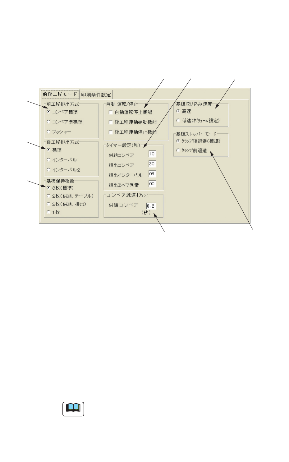4-17 Tg1299-ID-PM 0602-001 3.1 “ 前後工程モード ” タブ [2] 後工程排出方式 後工程に基板を排出する方式を選択します。 標準 : 後 工 程 の 装 置 が 出 し た 基 板 を 要 求 す る 信 号 ( ワ ー ク 要 求 信 号 ) を 受 け て、 本 装 置 が ワ ー ク搬送信号を O N にし、ワーク要求信号が O F F になるまで基板を排出する方式です。 基 板を 排 出 す る…