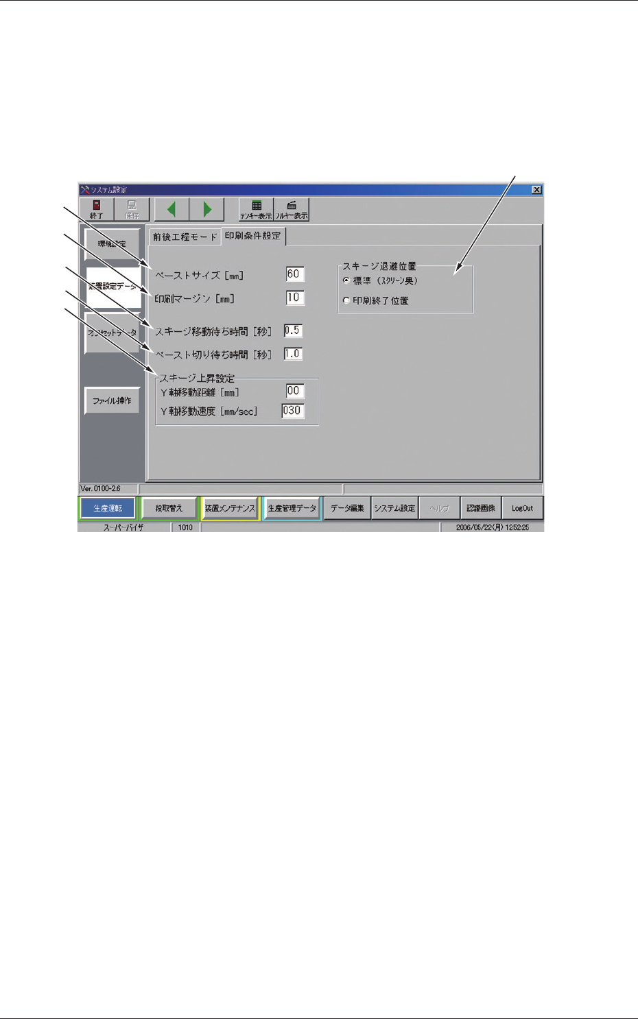 4-20 Tg1299-ID-PM 0607-002 3.2 “ 印刷条件設定 ” タブ 3.2 “ 印刷条件設定 ” タブ • シートの表示 “ 装置設定データ ” サブメニューバーの [ 印刷条件設定 ] タブを押 すと、以下のタブシートが表示されます。 [1] [2] [3] [6] [4] [5] Fig.3D15 “ 印刷条件設定 ” タブシート