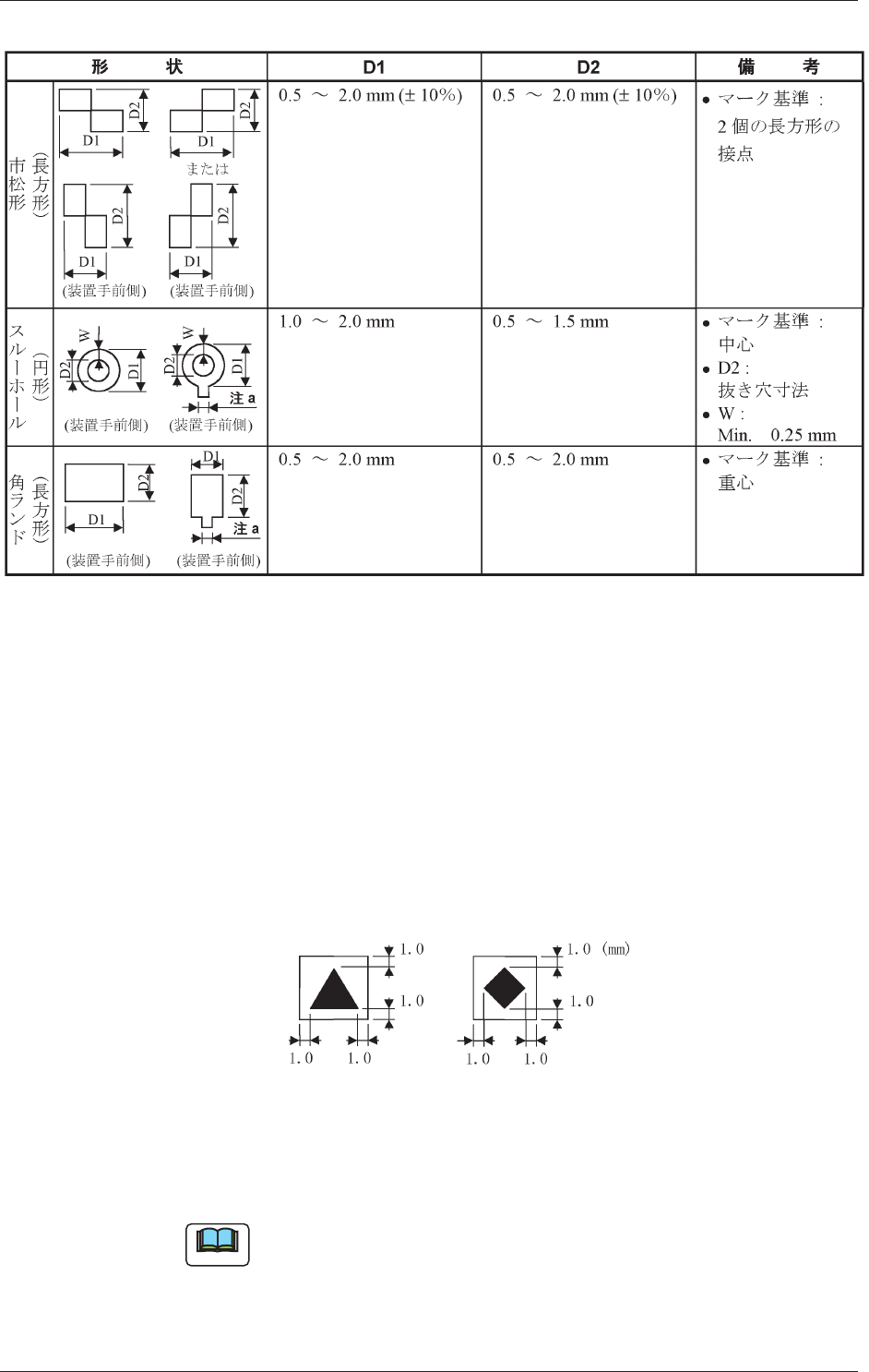 2 - 15 Tg 1299 -ID-PM 0602 - 001 1.2 オペレーションデータ (8) 認識マークについて 基板認識マーク 材質 • 銅箔(Au メッキおよび Ni メッキも可能。ただし鏡面でないこと。 ) • 半田メッキ • 半田レベラ 形状と寸法 Table 3B2