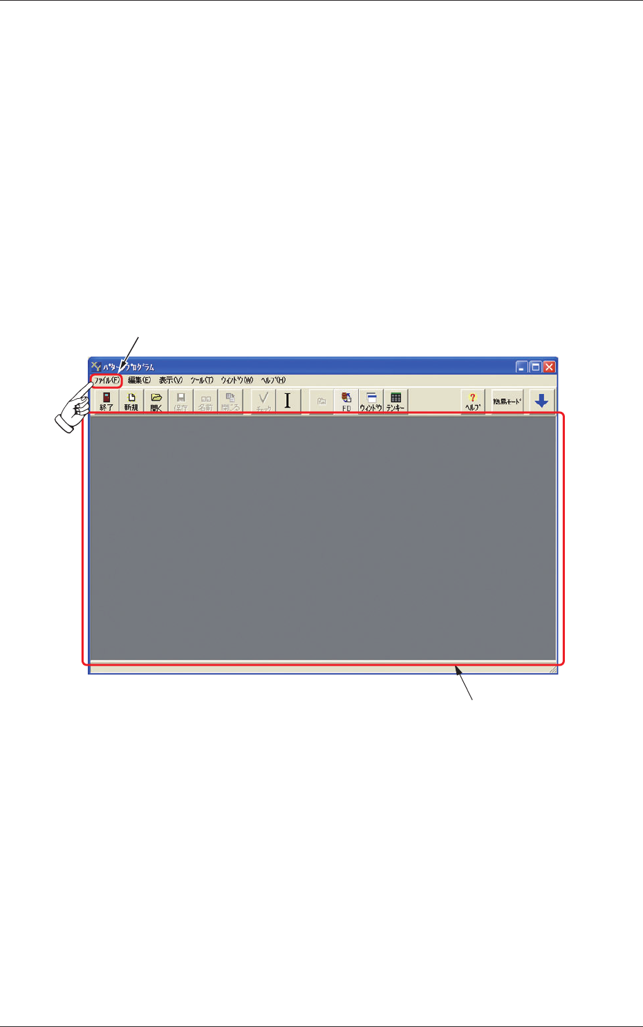 2 - 24 Tg 1299 -ID-PM 2. “ パターンプログラム ” 編集画面 0703 - 002 2. “ パターンプログラム ” 編集画面 2.1 画面の操作方法 2.1.1 画面の表示 “ パターンプログラム ” 編集画面を表示する手順について説明しま す。 • 操作手順 (1) メ イン メニ ュー バー の [ デー タ編 集 ] ボ タン を押 す と、 以下の “ パ ターンプログラム ” 初期画面が表示されます…