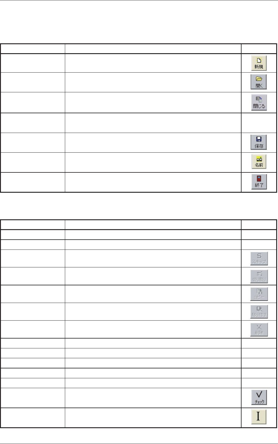 2 - 28 Tg 1299 -ID-PM 0602 - 001 2.1 画面の操作方法 (1) メニューバーおよびツールバーの機能 [ ファイル ] メニュー Table 3B4 操作メニュー 機 能 アイコン 新規作成 パターンプログラムの新規作成を行います。 開く 登録済みのパターンプログラムを編集シート上に表示し ます。 閉じる 編集シート上に表示されているパターンプログラムのう ち、アクティブのものを閉じます。 全て閉じる 編…