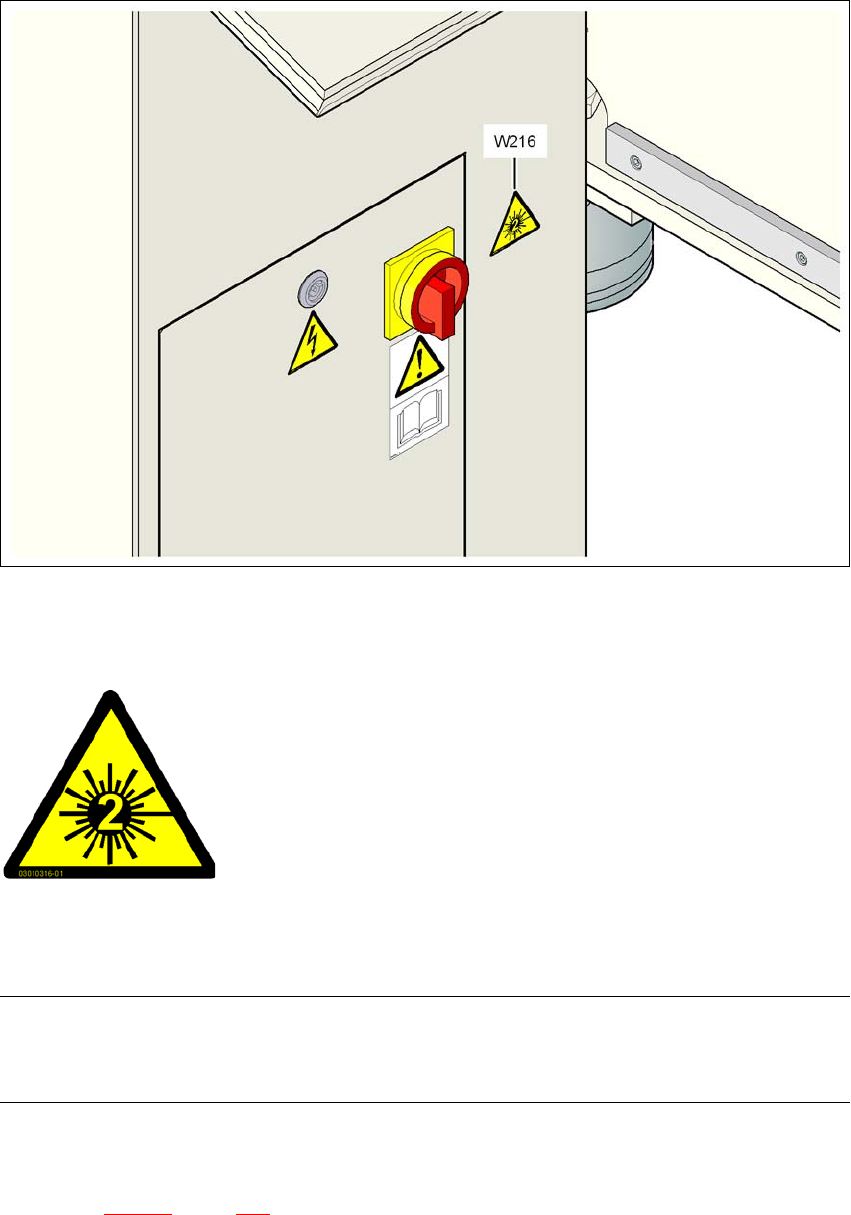 Varningsskylt W216 "Laserklass 2" på beklädnaden sidan om huvudströmbrytaren