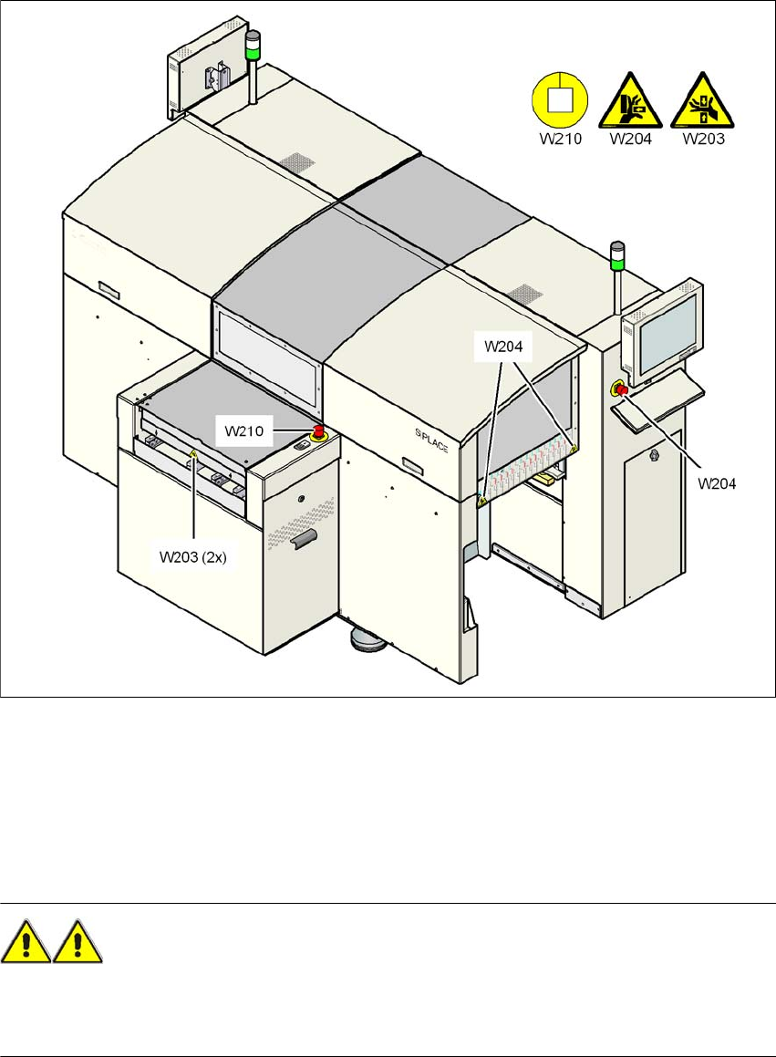 Skötselinstruktion SIPLACE D1/D2 2 Driftsäkerhet Från programversion SR.605.xx Ut gåva 07/2008 SE 2.2 Varningsskyltar 43 2.2.1.1 V arningsskylt W201 2 Pos W201 på bild 2.2 - 1 , sidan 41 (antal per automat: 1) 2.2.1.2 V …