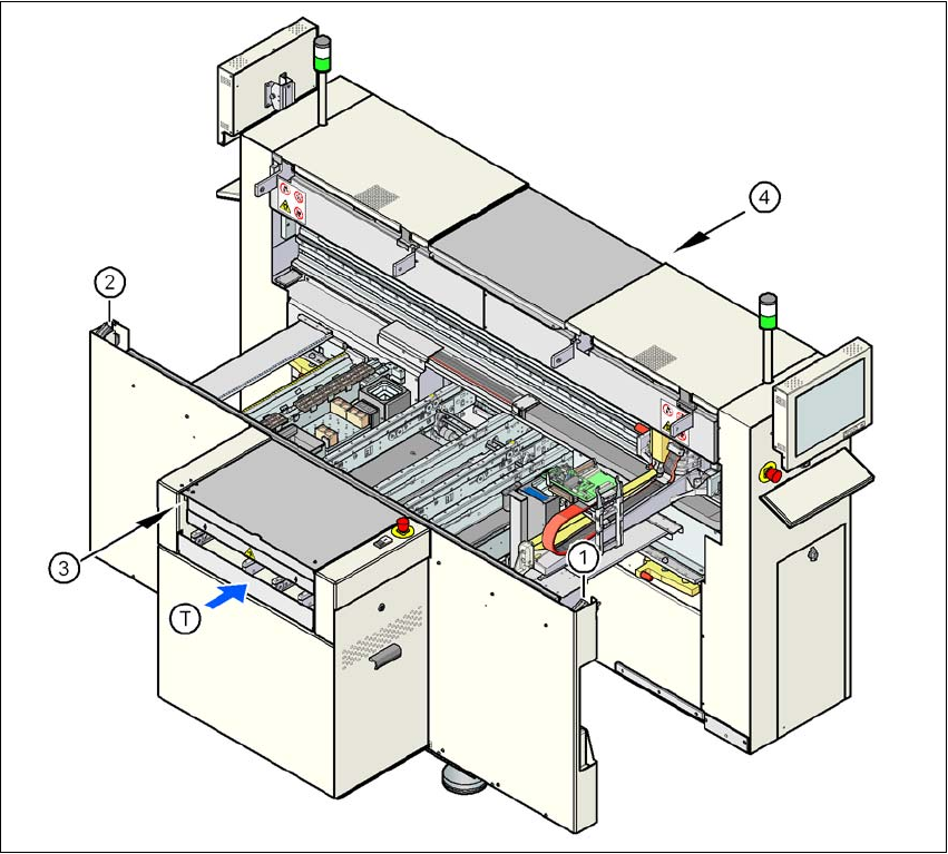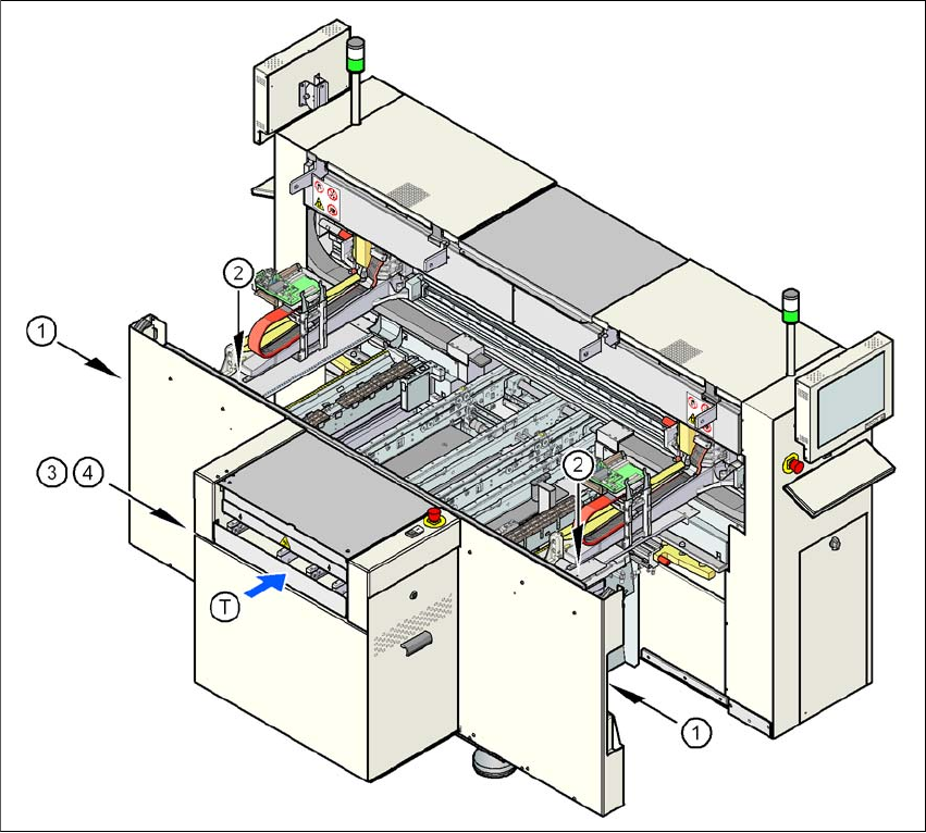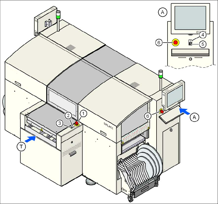 Skötselinstruktion SIPLACE D1/D2 2 Driftsäkerhet Från programversion SR.605.xx Utgåva 07/2008 SE 2.6 Säkerhetsanordningar 71 2.6.2.2 Placering för skyddsbryt are på automaten 2 Bild 2.6 - 6 Placering för skyddsbrytare på…