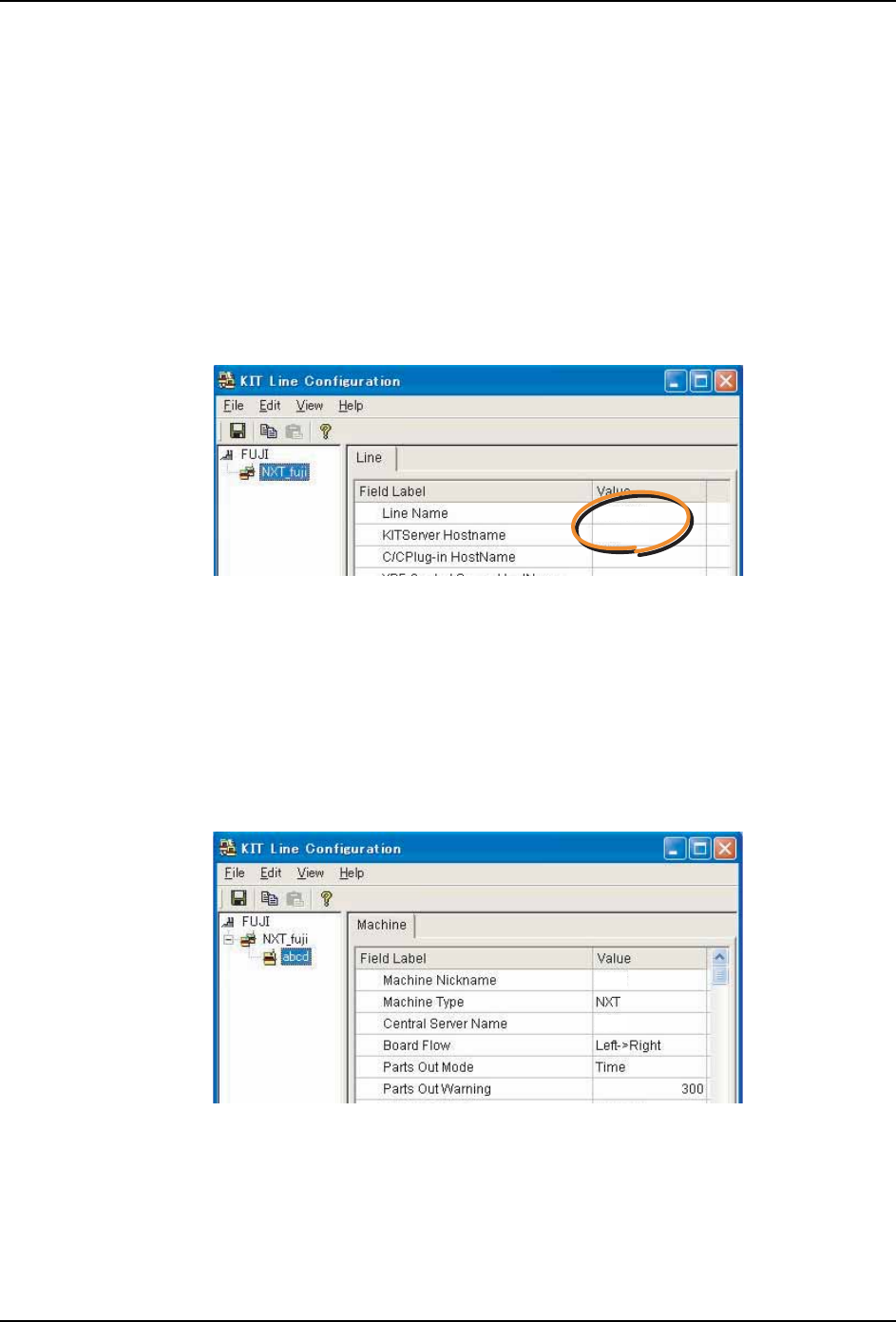5. 在 [Line Name] 数据字段设定 AIMEX-3c 机的生产线名称,在 [KITServer Hostname] 的