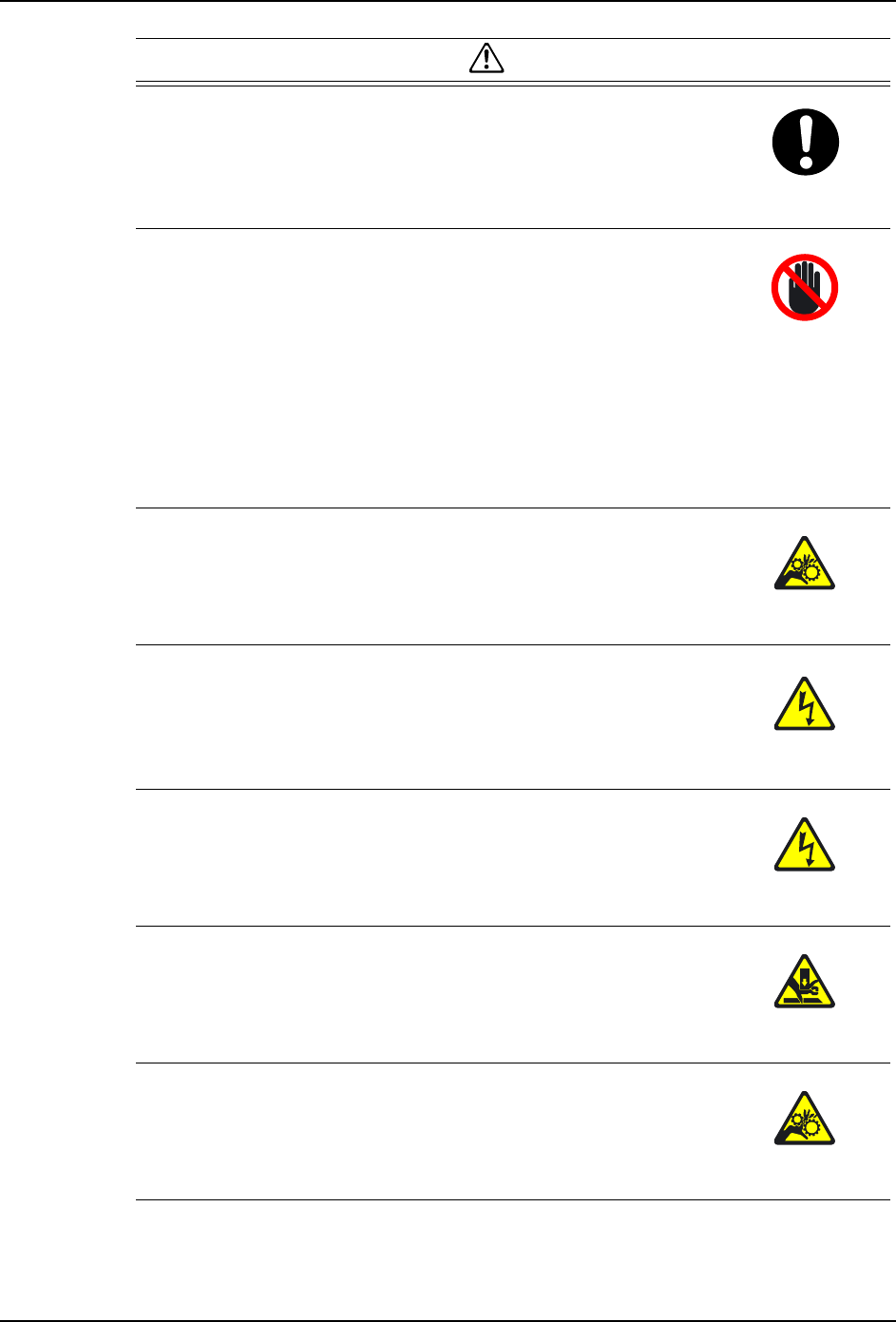 1. 安全指南 SET-AIMEX3C-L-001S0 2 AIMEX IIIc 安装手册 1.2 所有机型通用的注意事项 危险 无论机器处于全自动运行的状态还 是处于执行单个动作的状态,都 请不要靠近其运动部位。 ·如果身体或衣服被机器缠住的话 ,可能会引发重大伤亡事故。 警告 请不要将手或身体伸入搬运轨的开 口部位。 ·如果手或身体被机器缠住的话 ,可能会导致人体受伤。 ·单独使用这款设备时,请 在搬运轨开口处加装防护用具或使 用联…