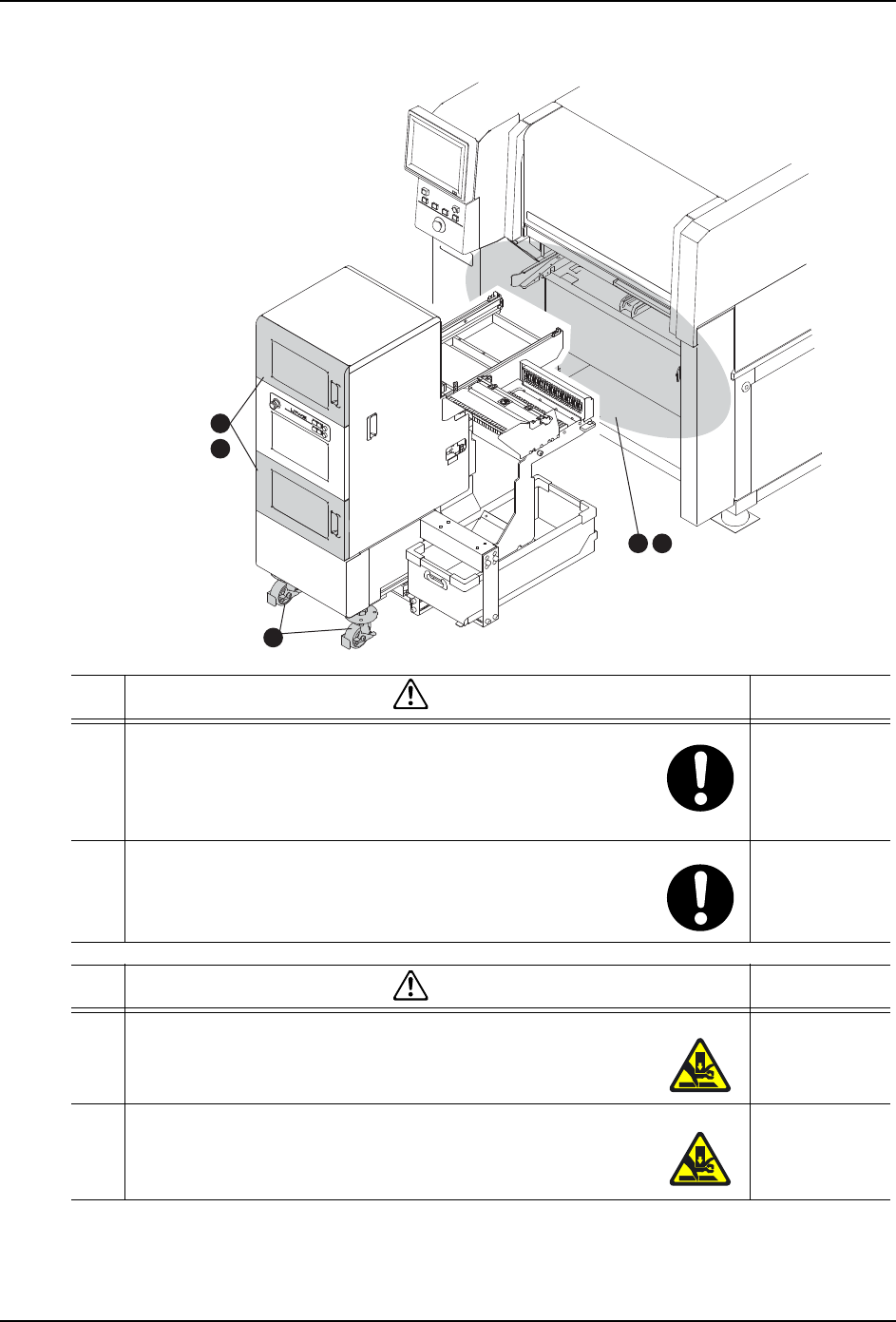 SET-AIMEX3C-L-001S0 1. 安全指南 AIMEX IIIc 安装手册 13 1.3.4 料盘单元 -LTW2 30MEC-0820-a 1 2 3 5 4 警告 相关章节 1 将料盘单元与机器组合到一起之 前,请务必确认料盘单元与 机器之间是否站有其他人。 "2.13" ·如果人被夹在料盘单元与机 器之间,可能会引发重大伤亡 事故。 2 将料盘单元与机器分离后,请锁 住脚轮。 "2.13&…