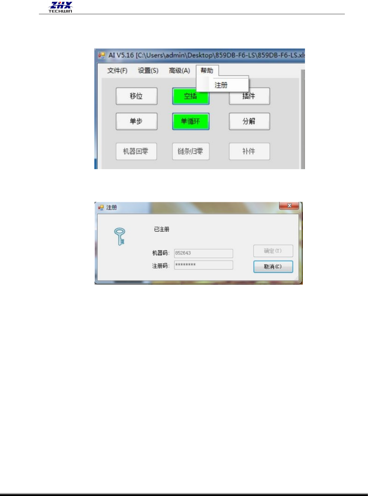 注册:自动插件机到期系统会提示注册信息,(如有快过期的设备,请把机器码记录下来与