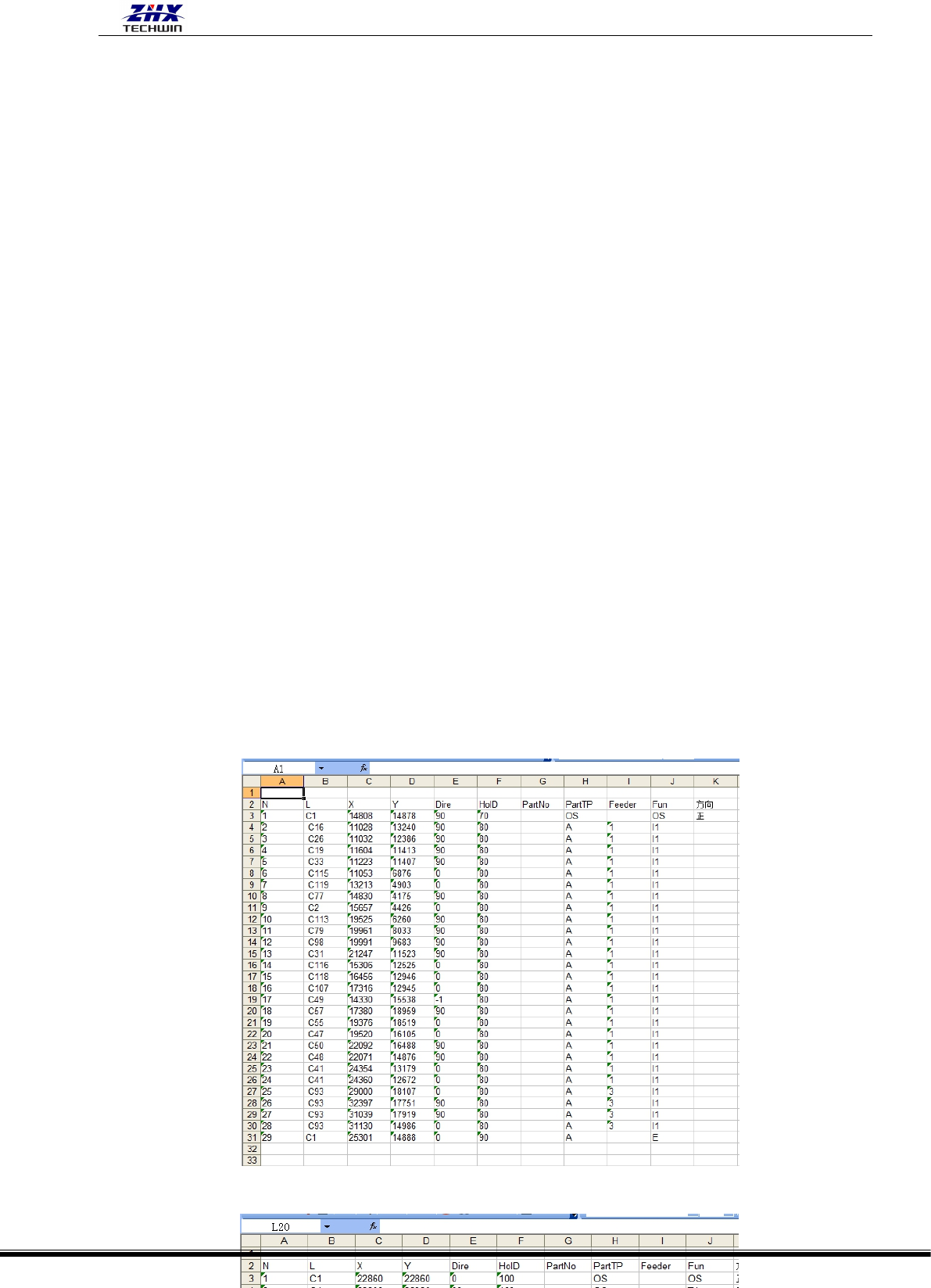 ZHX-R20C&D(-IN)立式插件机说明书 深圳市中禾旭精密机械有限公司 www.zhxai.com - 33 - 文件名: 程序的第一行第一列,固定不变; 程序名: 程序的第一行第二列, 可以任意命名并使人能清楚是哪种 PCB 板的程序。 (建议 用 PCB 板型号); N: 程序的第二行第一列,序号列; L: 程序的第二行第二列,PCB 板上插入点的元件编号,如:C1 等; X: 程序的第二行第三列,X 坐标列(左右方向…