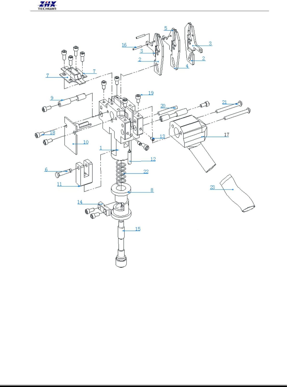 ZHX-R20C&D(-IN)立式插件机说明书 深圳市中禾旭精密机械有限公司 www.zhxai.com - 78 - 10.剪 脚头保养 1)剪脚头的拆卸。 松开 ○ 1 WJ-10149 上较大的四个剪脚头固定螺丝,松开(9)LS1D-07034 上的螺丝,把检 测线拉出来,就可以把整个剪脚头拿出来。 2)剪脚头的保养。 (1).松开 (7) 上的螺丝, 然后松开(10)、 (20)、 (19)上的螺丝把(20)拉出来, 再…