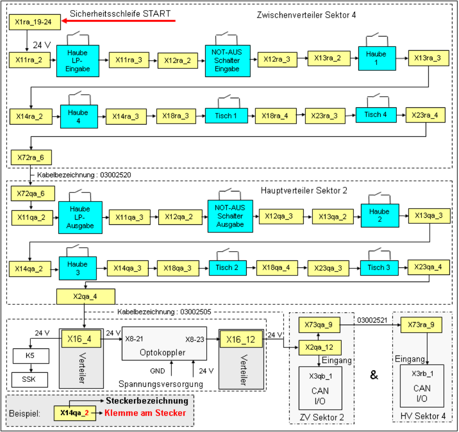 Wenn der NOT-HALT-Kreis geschlossen ist, liegen 24 V an K5, Kontakt 3 an. Ein weiteres 24 V-Signal