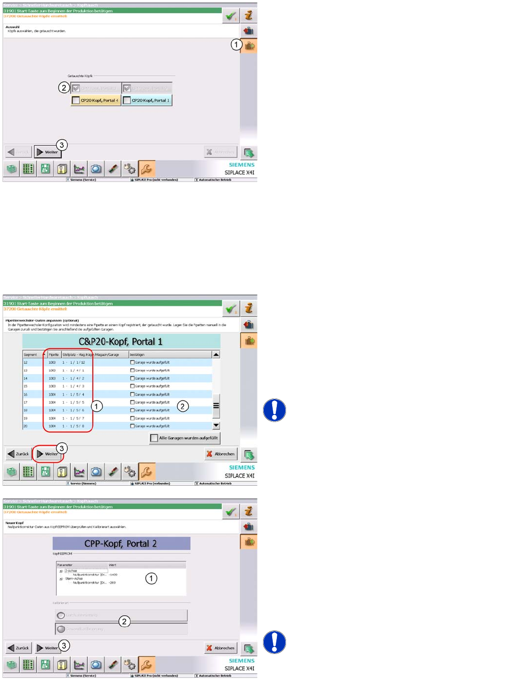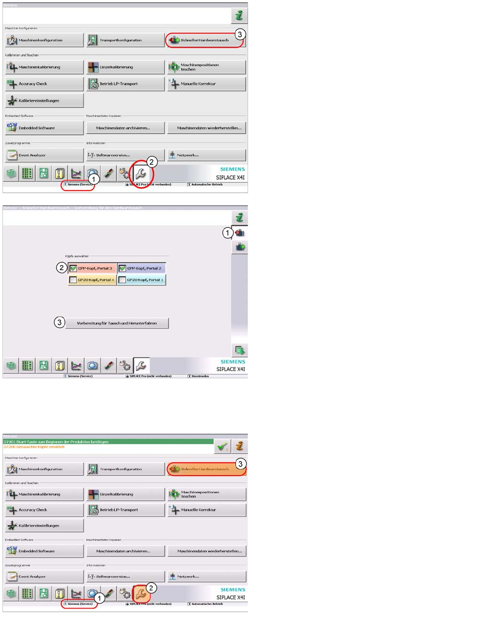 Kalibrierung Weitere Funktionen Schneller Kopftausch 481 Student Guide SIPLACE X-Serie und X4I FSE Ablauf: Demontage Bestückköpfe Nach dem Tau sch 12.6.5.5 Nach dem Tausch Legende 1. Logon als Service 2. Drücken Sie den …