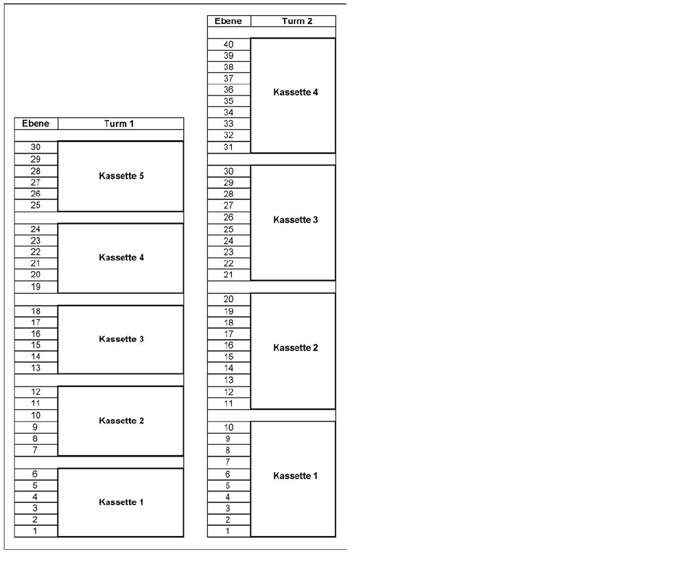 Die Hubachse von Turm 2 kann 4 Kassetten mit jeweils