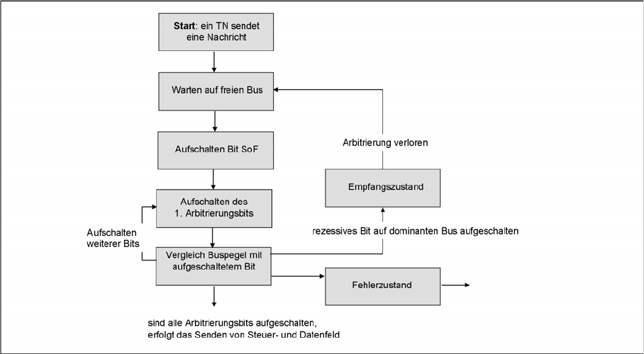 Ein solcher Buszugriffskonflikt wird durch bitweises Aufschalten des Nachrichtenarbitrierungsfeldes