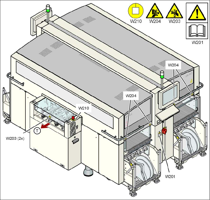 Fig. 2.2 - 1 Warning labels W201, W203, W204 and W210 on the machine - part 1