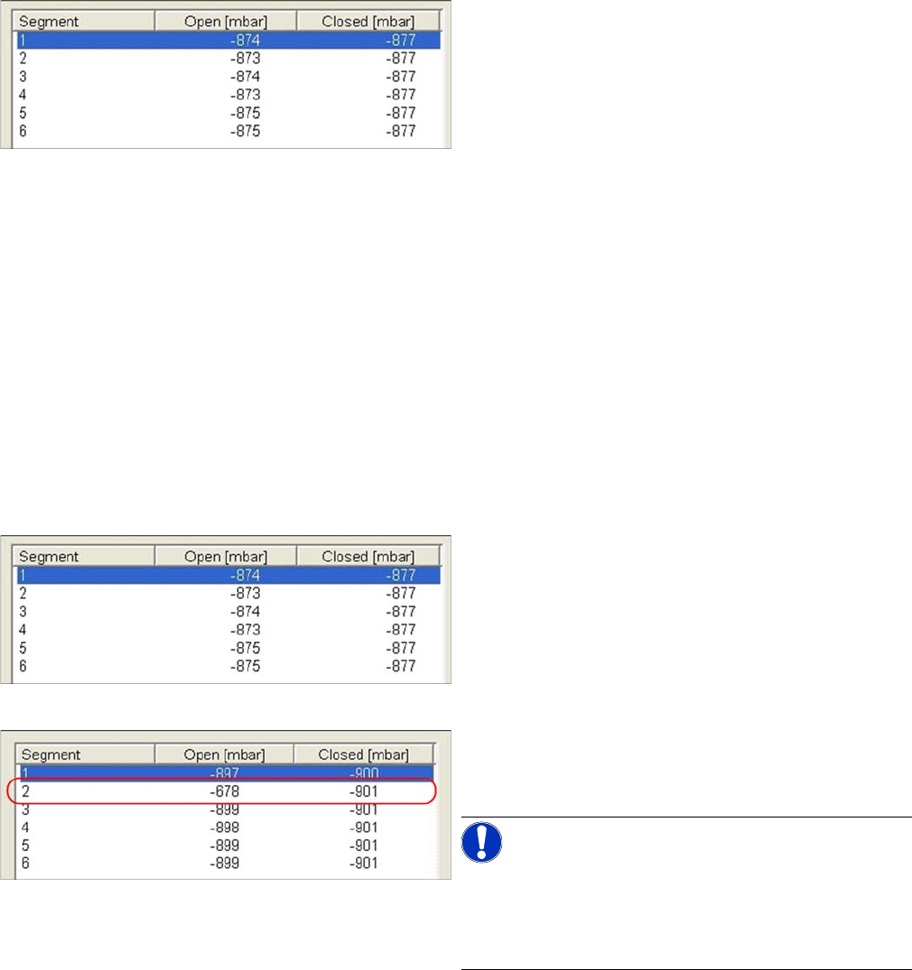 Settings Vacuum Test Service Manual SIPLACE Placement Heads DLM3/DLM4 77 Scenario 2 Example of defective vacuum values, which indicate a damaged silicone hose on segment 1 and an open nozzle at segment 3. NOTICE Silicone…