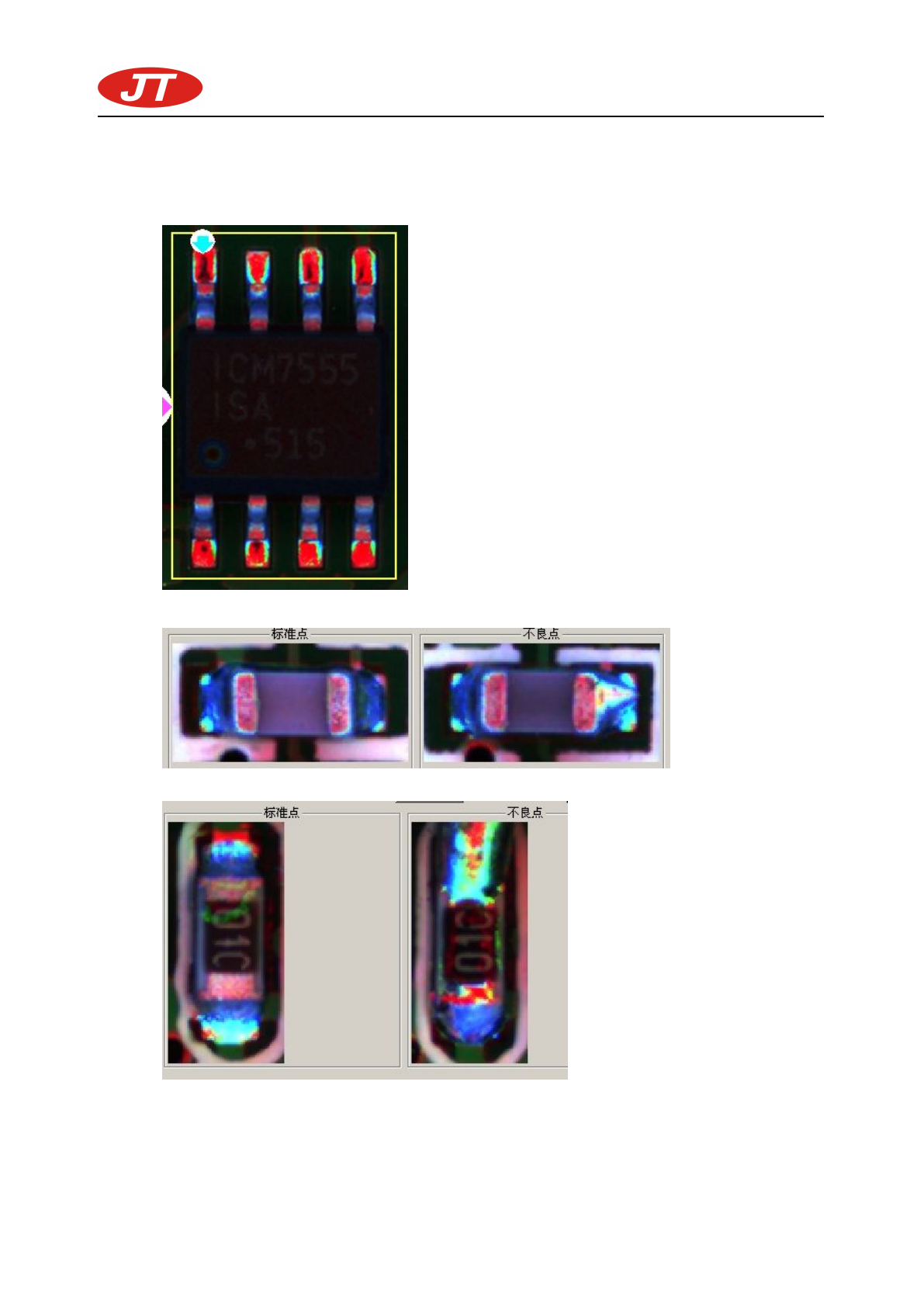 深圳市劲拓自 动化设备股份有限 公司 (培训资料 ) - 100- 2.QFN 焊接 检查: 3.板面 多件: 二、检测能力验证: 1、技术员及工程师应定时检查测试程式的可靠性:具体方法如下: A.参照 AOI 检 测参数设定标 准检查程式 各部份参 数是否合格, 如超出程式 设定范围,应 及时 修改。检测参 数设定标准请参照 《JT- AOI 各 类元件参数 设定说 明》 。 B.制 作相 应的不 良验 证板 ,每 1 小时测试 一次…