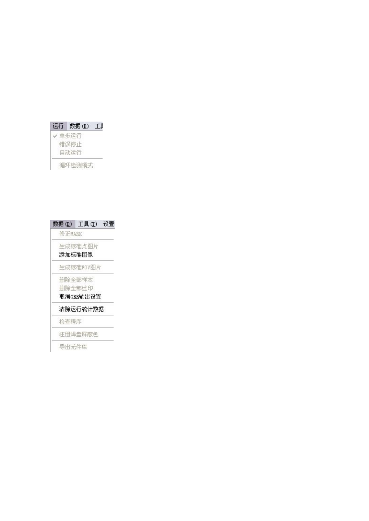 18 正反面标识测 试:用于设定正反 面标识测试。 编辑正反面测 试标记:用于编辑 正反测试标记 。 验证正反面测 试标记:用于验证 正反面的测试 标记。 程序 1 :用于调 试和显示程序 1 。 程序 2 :用于调 试和显示程序 2 。 显示焊盘:用 于设置显示焊盘。 显示虚焊检测 框:用于设置显示 虚焊检测框。 3.2.3 “运行 ”菜单 单步运行: 用于将当前工 程更改为单步 运行模式。 错误停止: 用于将当前工 程更改为错误 停…