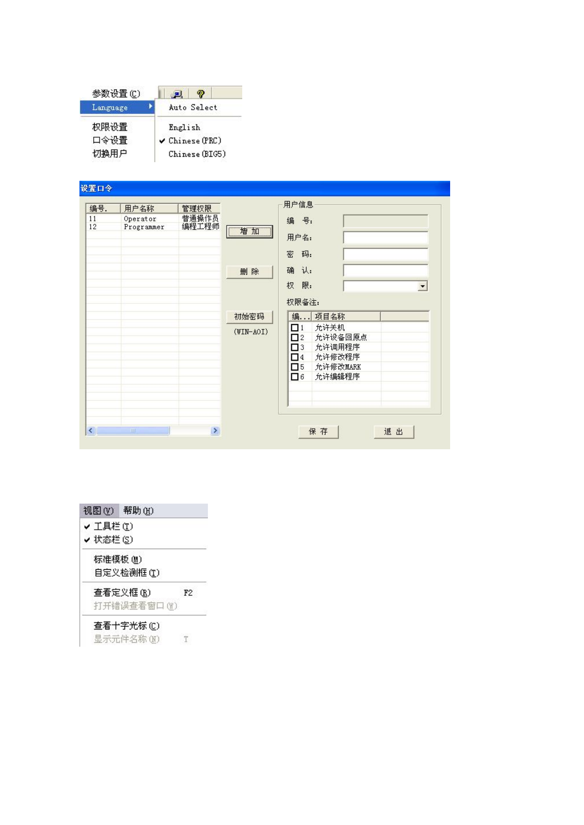 20 Language :用 于设置软件语 言。 权限设置:用 于更改各个用户的 权限及口令。 口令设置:用 于修改当前用户的 口令。 切换用户:用 于切换用户。 3.2.7 “ 视 图 ” 菜单 工具栏:用于 设置显示或隐藏工 具栏。 状态栏:用于 设置显示或隐藏状 态栏。 标准模板:用 于设置显示或隐藏 标准模板。 打开错误查看 窗口:用于打开错 误查看窗口。 显示元件名称 :用于显示元件名 。 3.2.8 " 帮 助 &…