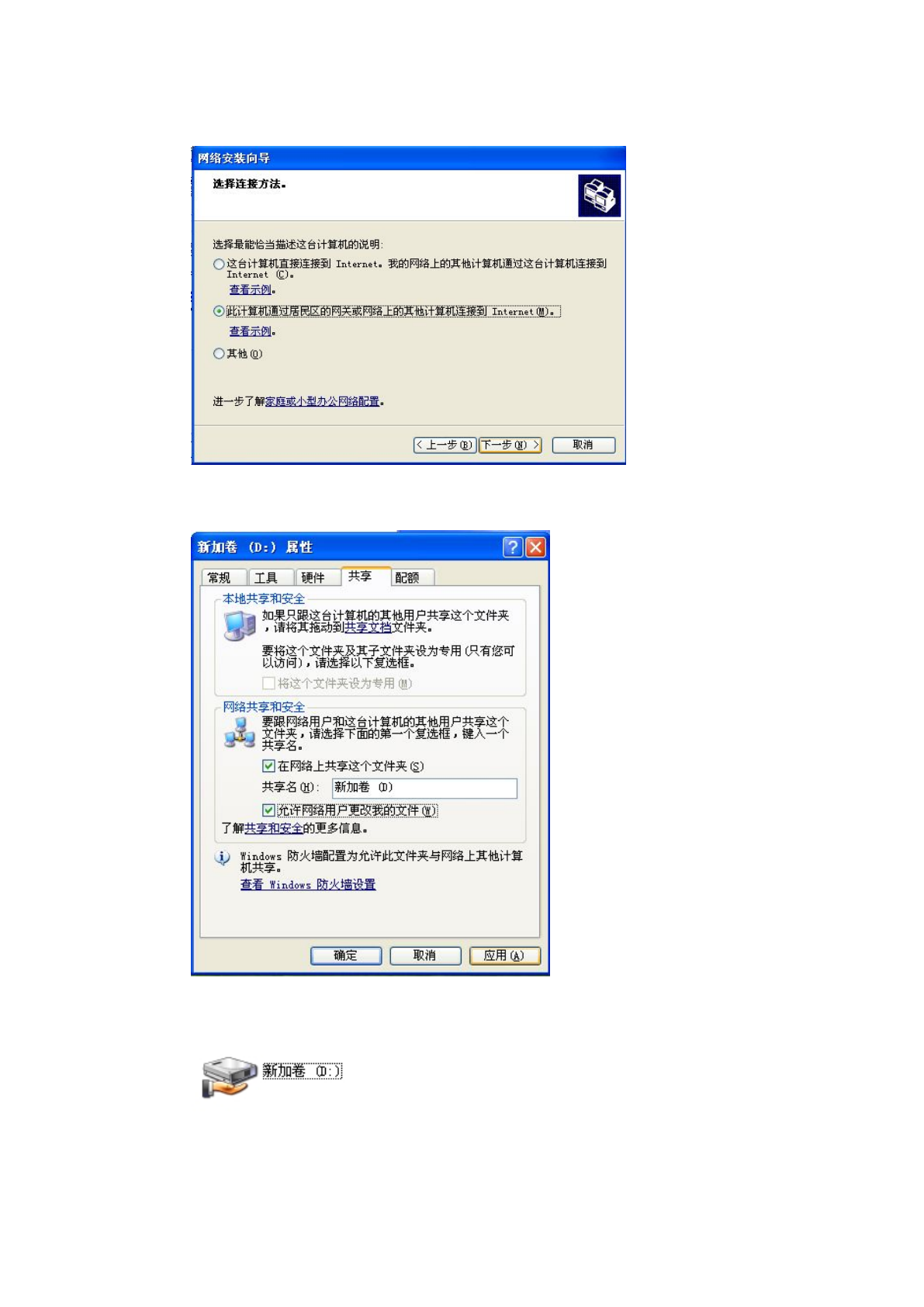 选择,并点击“应用”“确定”,硬盘共享结束,共享成功后,硬盘盘符下会出现一只手的图案,如下图: