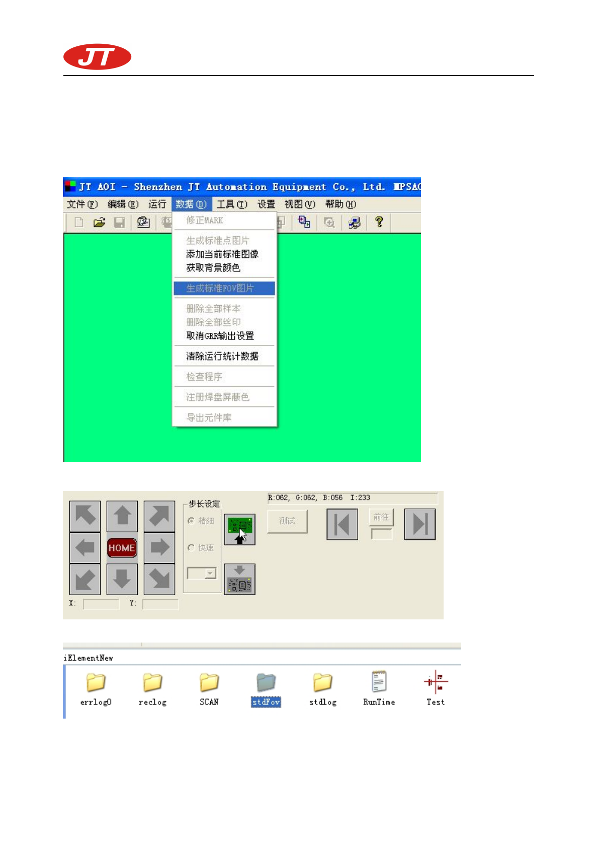 深圳市劲拓自 动化设备股份有限 公司 (培训资料 ) - 87- 附录 9 : 多件检测功 能说明 第一步:扫 描标准 FOV 图像 1 、 加载一片 好的 PCB 到 AOI 上, 并加载测量程序 2 、 选择菜单 上:数据 生成标准 FOV 图像 3 、 点击‘进板 ’按钮即可自动 生成标准 FOV 图像 4 、 再找一片 好的 PCB ,生 成第二组标准 FOV 图像,图 像目录所在: