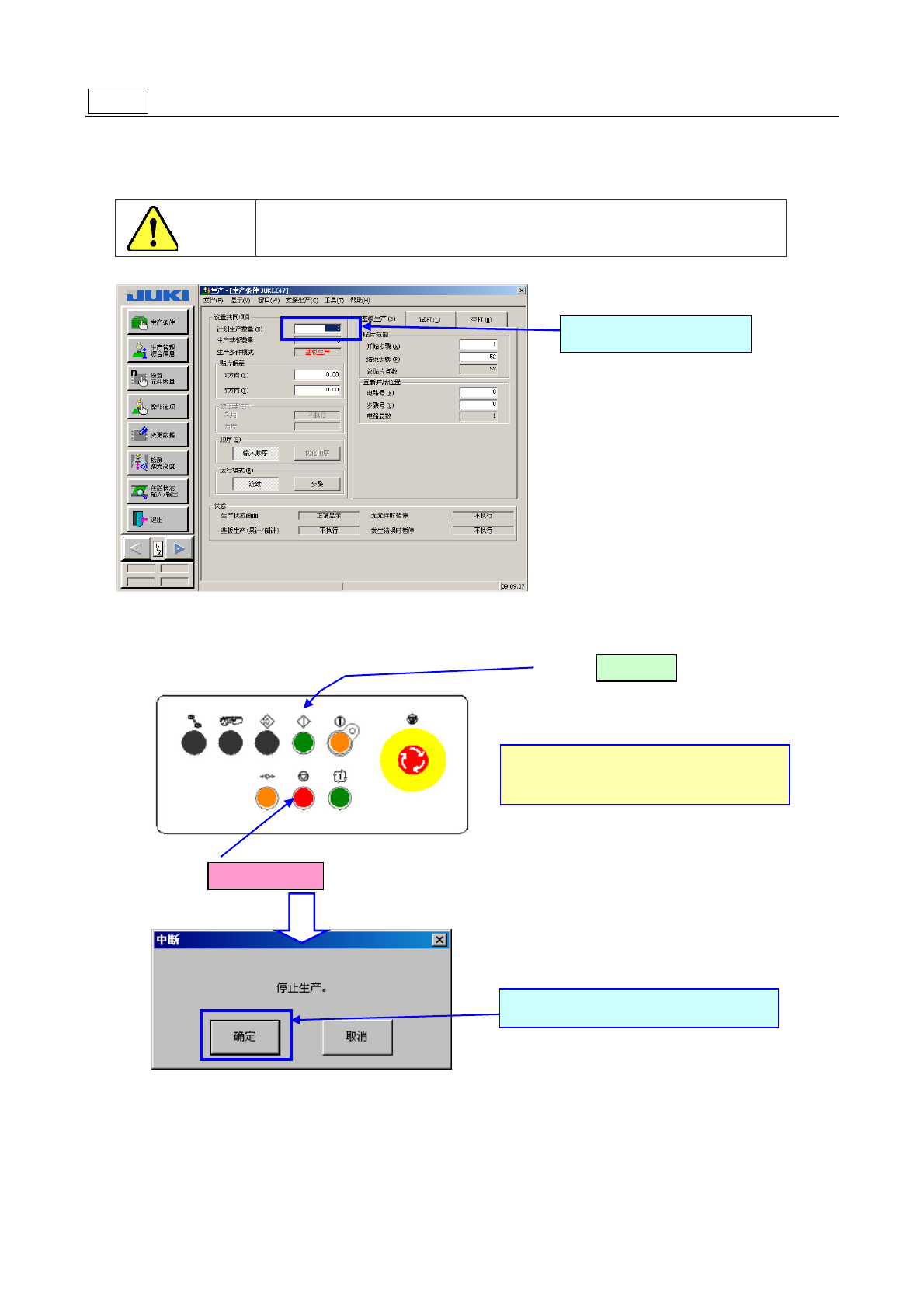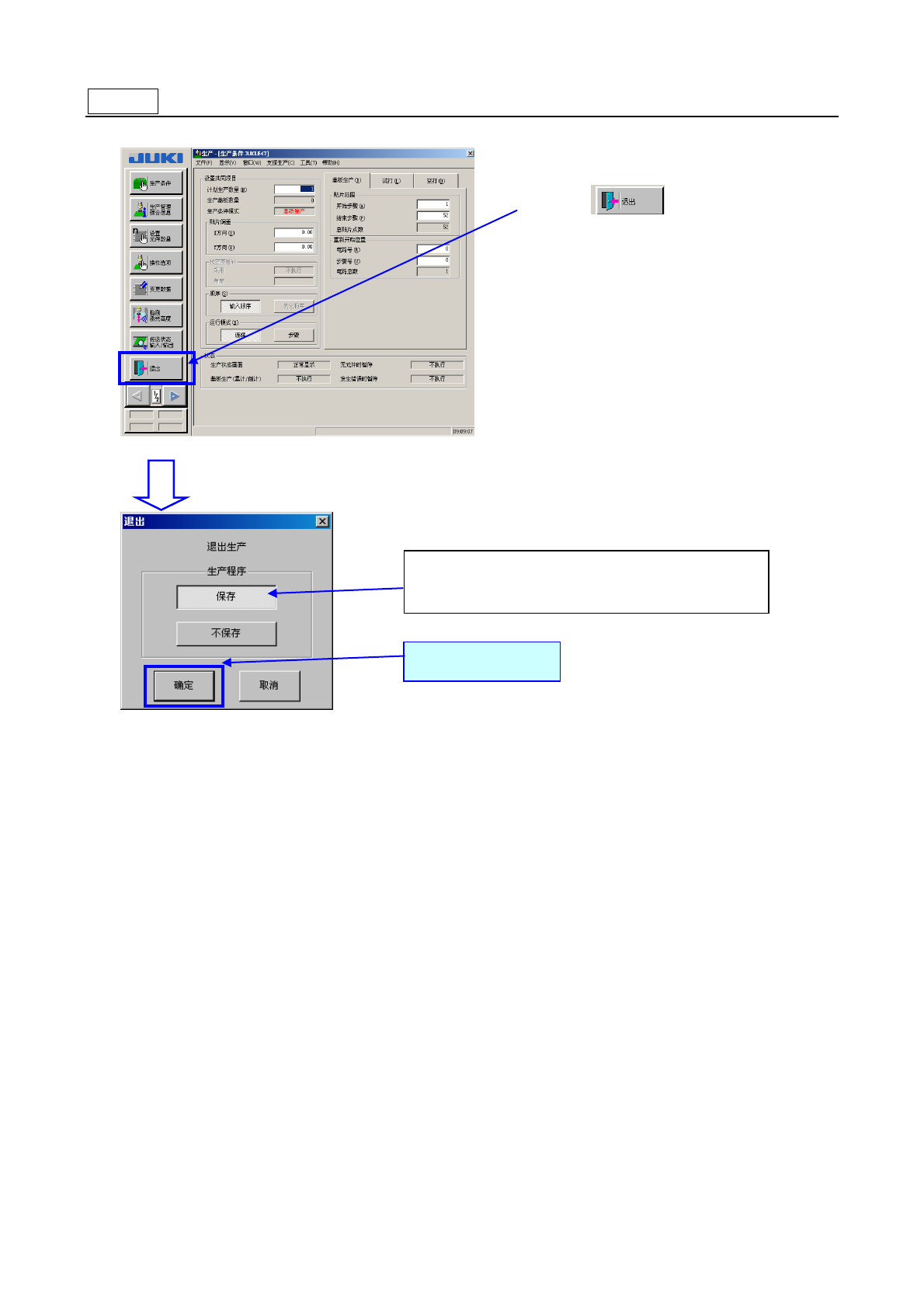 操作手册 步骤 10 退出生产画面 请选择 选择 「保存」 ,把生产中变更的程序和生产 管理信息保存下来。 请选择「确定」 。 2- 19