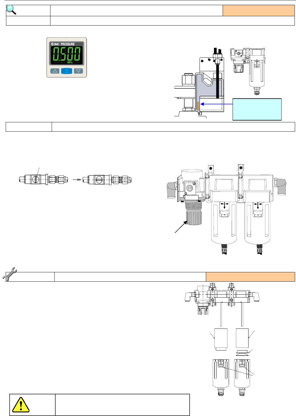 操作手册 3-2 3-2 各部分的检查 1) 在压力表上确认 0.5 MPa。 3 ) 若是排水管连接的瓶内存了水、 油,请倒干净。 2) 若压力值为 0.45MPa~0.55MPa 以外时, 请检查工厂内是否有空气泄漏,如果没 有异常,请按「调整方法」重新调整压力。 1) 打开旋钮①。 1) 2) 检查项目 3-2-1 气压 实施频度 :每天 检查内容 确认初压,检查排水管 调整方法 调整初压 ・ 检查 更换 更换过滤器零件 更换标准…