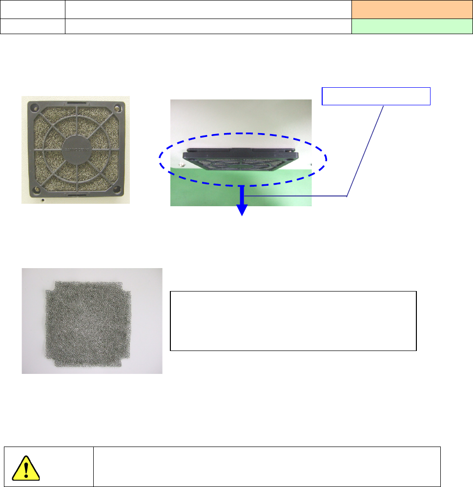 操作手册 (1) 拆下风扇马达的过滤器。 把黑色树脂部分向身前方向拉,即可拆下。 风扇马达 机器侧面 (2) 用吸尘器吸过滤器的灰尘。 风扇过滤器 (3) 把过滤器装回去。确认风扇运转是否正常。 因风扇高速旋转,在接通电源的状态下进行作业有危险。 要进行作业时,请务必切断电源。 清扫部位 3-3- 10 风扇马达 实施频度:每月 清扫内容 清扫过滤器的灰尘、异物 使用工具: 吸尘器 无法去除脏污时,请更换过滤器。 名称:风扇过滤器 件号…