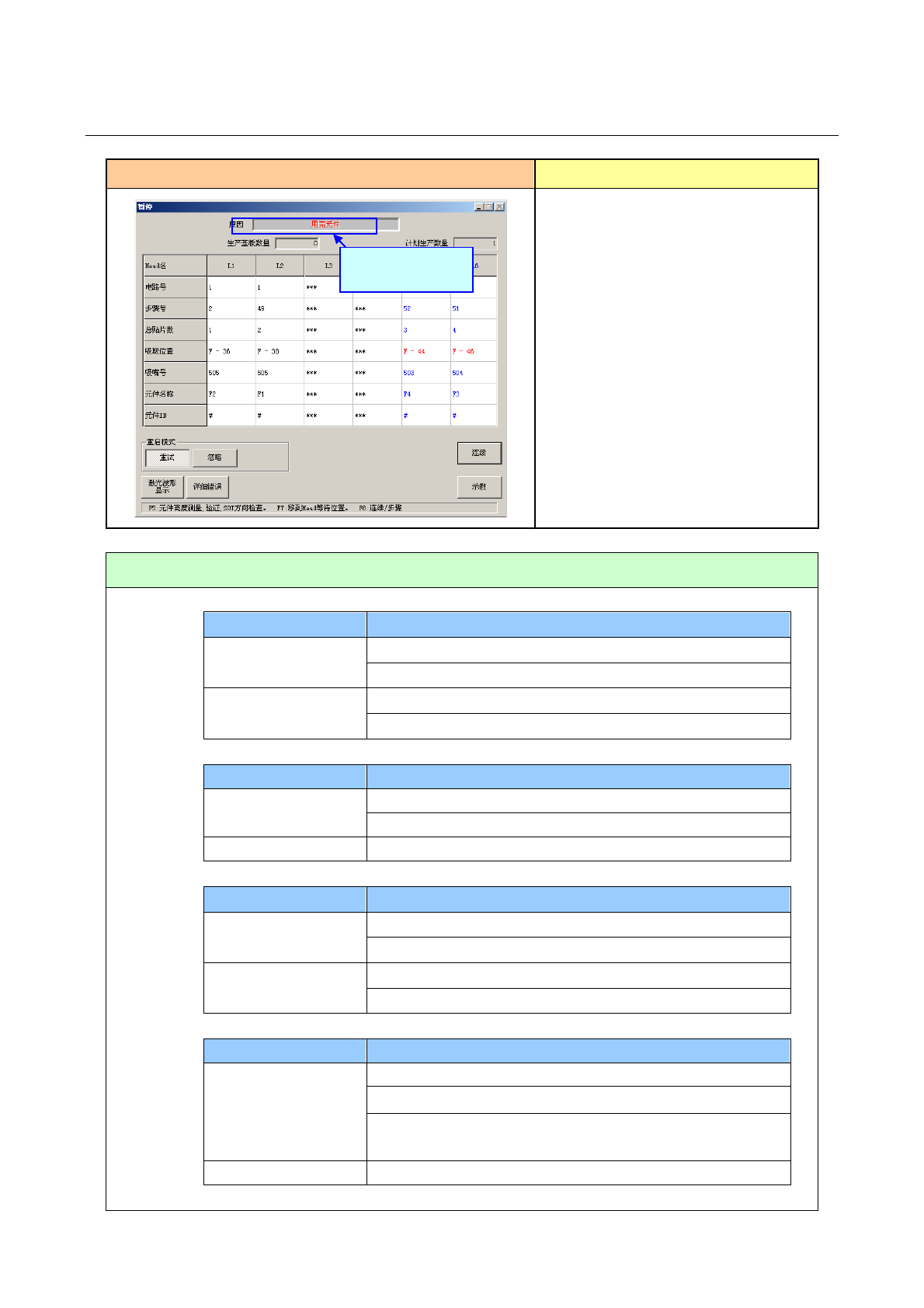 操作手册 4-5 发生错误( LA 识别错误、芯片站立、异元件判定 ) 错误画面 错误要因、原因 生产程序的值与激光计算 的值不一致 时显示错误。 ①芯片站立错误。 ②异元件错误。 ③ LA( 激光 ) 重试超次。 ④吸取偏移。 处理错误的方法 ☆ 芯片站立错误 (仅限于在元件数据「检查」中设置过「芯片站立」的元件) 发生错误的时间 确认和处理 补充元件后立即 确认检查元件有无挂错位 检查元件吸取位置有无问题,重新示教 正常生产中 重新…