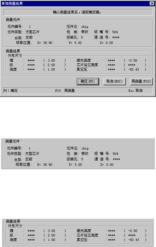 第 6 章 编辑辅 助功能 6.5.3.4 单独测量结果 单独测量结束后,结果显示在以下对话框。 图 6.5-19 单独测量结果对话框 z 测量元件 显示元件内容和吸取位置。 z 测量结果 显示测量结果的数值。()内表示元件数据的原数值。 未测量的项目,显示, “****” z 确定([F8]键) 将测量结果变为有效状态,覆盖到元件数据上。然后返回单独测量条件设定画面。 z 取消([ESC]键) 测量结果为无效,然后返回原先单独测量条件…