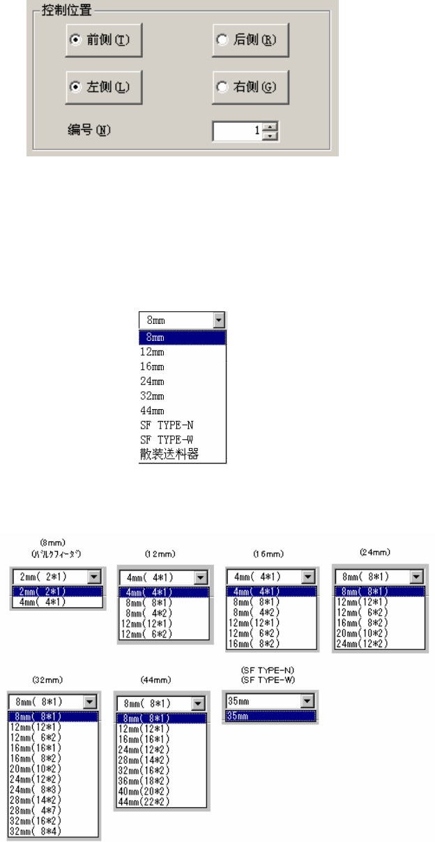 第 10 章 手动 控制 (2) 控制位 置 在控制项目中选择[卷带送料动作]时,用单选按钮选择控制位置,在编辑框内 输入编号。 在控制项目中选择[一起送料动作]时,用单选按钮选择控制位置,以选择控制 针的位置。 (3) 送料器 种类 控制项目选择[卷带送料动作]时,用组合框选择传送带宽度和传送间隔。 控制项目选择[一起送料动作]时,则不能设置送料器种类。 单击▼,或者按下[Al t] + [↓]键 ,显 示 如下列表。 传送带宽度 组…