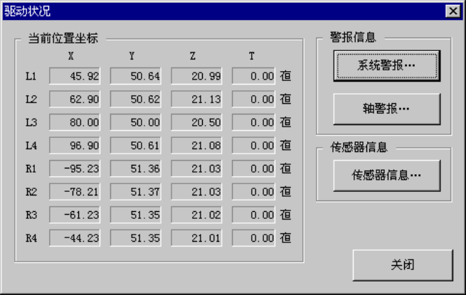 第 10 章 手动 控制 10.2.5.5 驱动器状况 选择菜单栏的[控制]→[ 其它]→[ 驱动器 状况] 后,显 示下图的[驱动状况] 对话框。 图 10.2-25 驱 动状 况对话 框 按下[系统警报] 按钮、 [轴警报]按钮、 [ 传感器信息]按钮后, 分别显示 图 10.2-26 系 统警 报、 图 10 .2 -27 轴警报信息对话框 、 图 10.2-28 传感器 信息 对话框 。 (1 ) 当前位置 坐标 显示各轴的当前…
