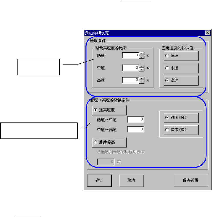 从速度设置中选择[低速→高速]、按下[详细设定]按钮后,显示下列[预热详细设定]