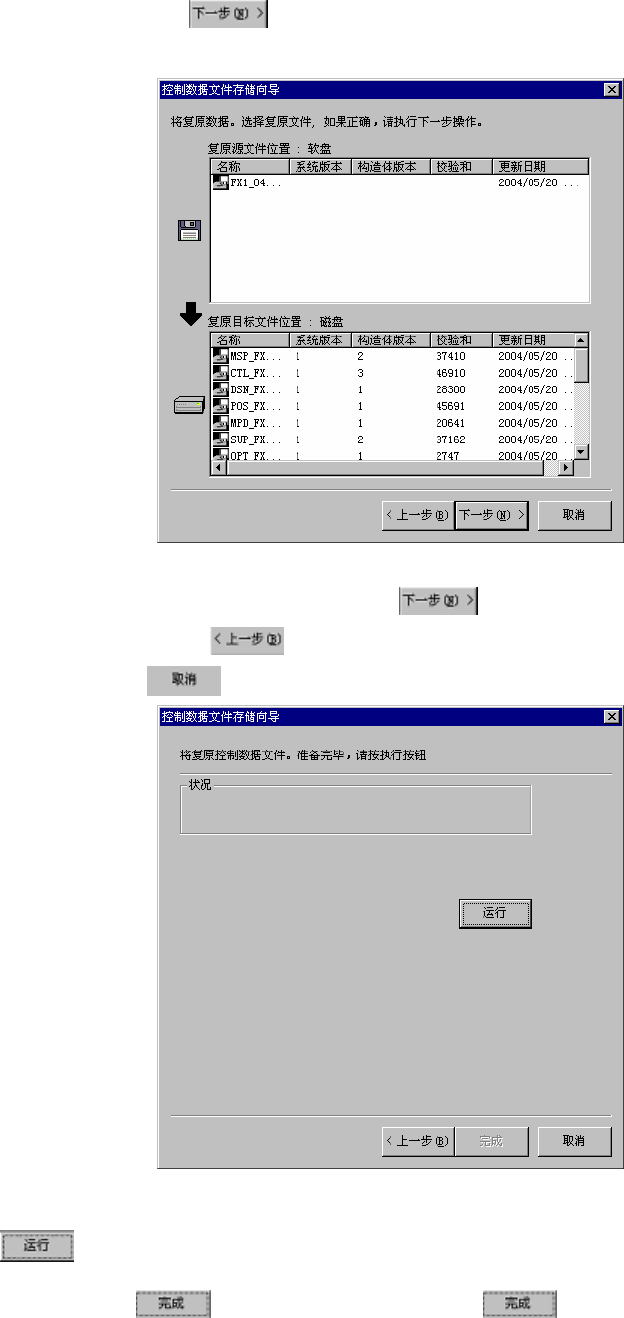第 4 章 桌面 指定复原的来源后,按 按钮,显示 下列对话框。 (复原源文件的位置被指定为软盘的示例。 ) 图 4.2.1.9-13 [从软盘等恢复控制数据文件]对话框 在复原源文件列表上选择可复原的文件后,按 按钮。 要变更操作内容等时,按 按钮。 要结束操作时,按 按钮。 图 4.2.1.9-14 [实施从软盘等复原控制数据文件]对话框 按 按钮,复原控制数据。 复原处理完成后, 按钮变为有效状态,请按下 。 处理结束后,要使修复…