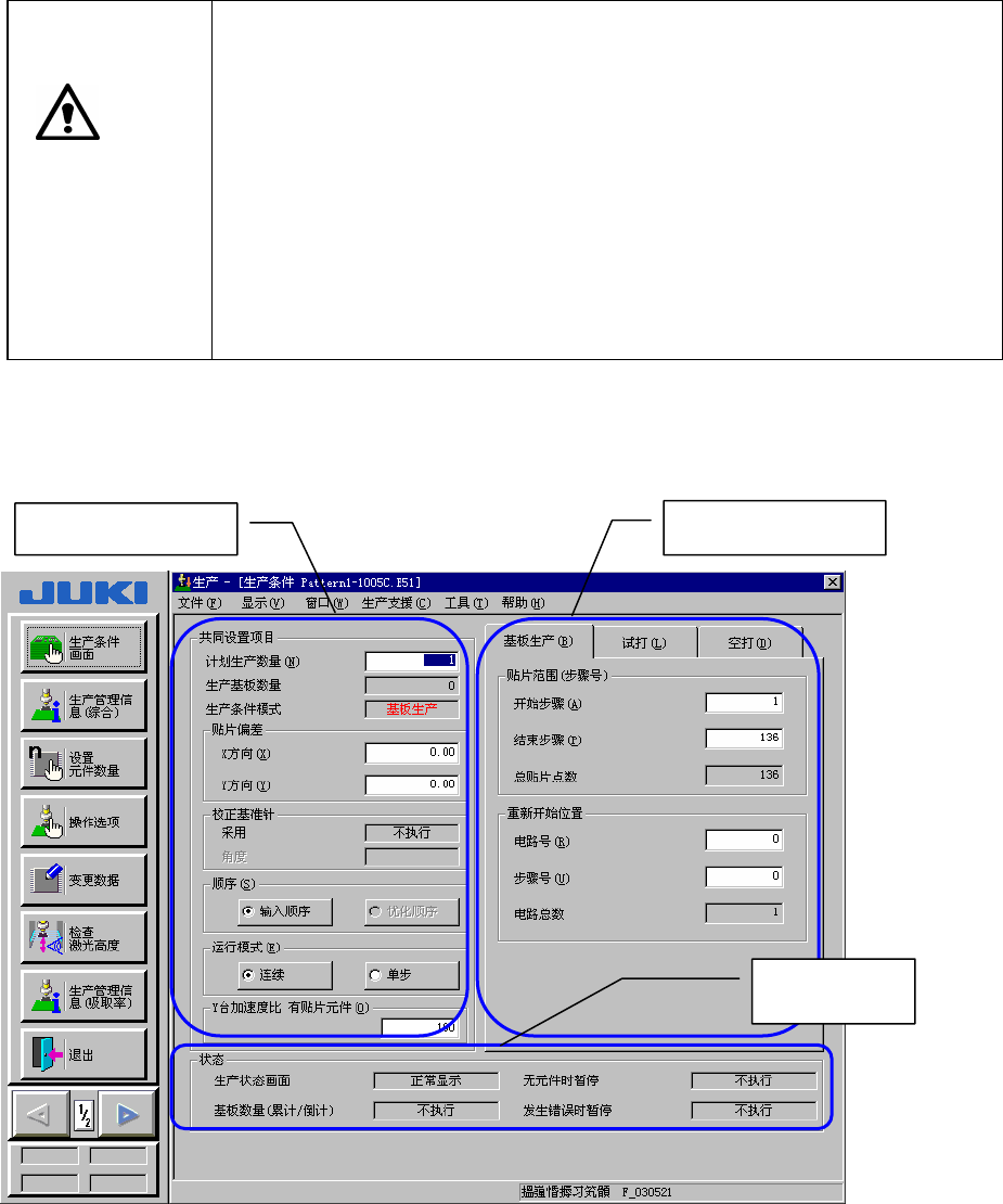 第 8 章 生产 8. 2 生产画面 8. 2. 1 生产条件画面 各生产条件画面的内容和设置说明如下。 设定生产条件画面后,按<START>开关,开始生产。 注意 按下<START>开关后,贴片头立即移动,开始生产。 为防止发生人身伤害, 在设备运行中, 切勿将手伸入装置内部, 或将脸和头靠 近装置。 按<START>开关前,务必确认设备内部无人作业。 按<START>开关前,请确认设备…