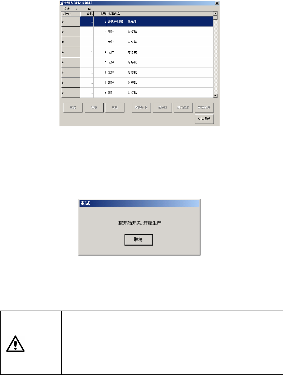 重试列表 (未贴片列表)的功能:提供生产中发生的错误情况,用以判断是否继续生产。