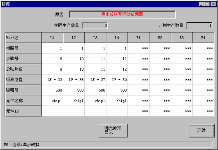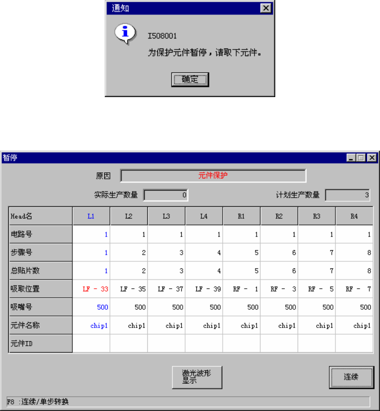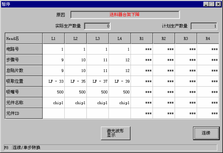 在生产操作中送料器台架下降时,会显示如下对话框,机器进入暂停状态。