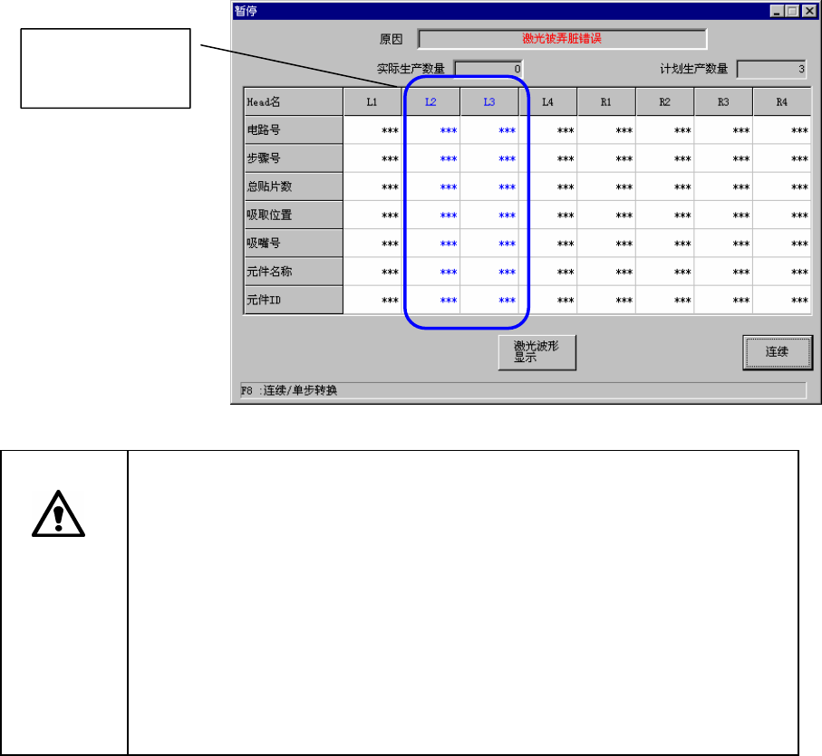 在暂停对话框上显示的蓝色编号为检测出激光污浊的贴片头。