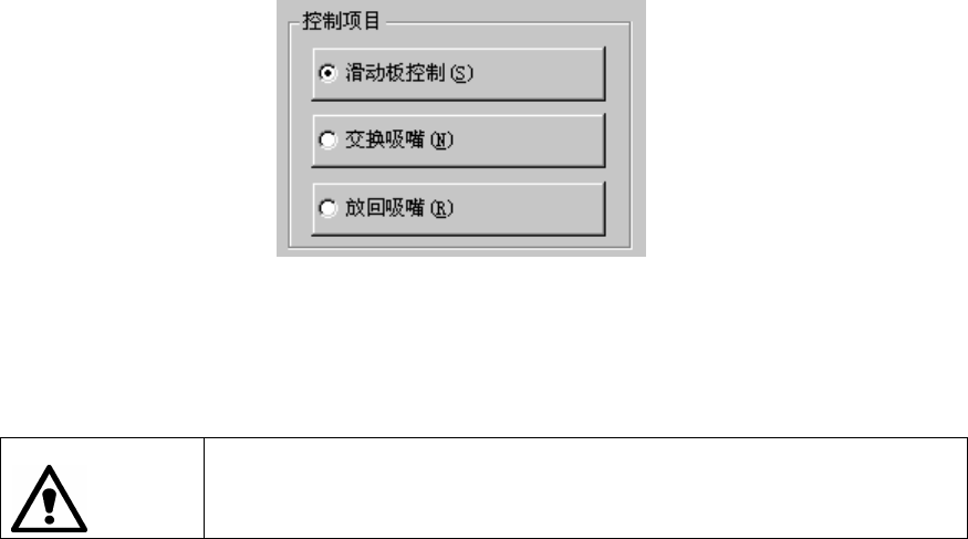 第 10 章 手动 控制 (3) 控制项 目 用单选按钮选择控制项目。 (4) 控制按 钮 用控制按钮操作控制项目。 不同的控制项目,显示不同 控制按钮。 按下控制按钮后,设备 即开始运行。按下控制按钮前,请务必确认设备 内部 没有正在操作的人。另 外,为防止人身伤害,设备运行中切勿把手伸入 设备 内部,脸和头也不要靠近。 警告 1) 滑 动板 控制 控制 AT C 滑动板的开 / 关。 选中[控制项目] 的[滑动板控制]时 , 选择[…