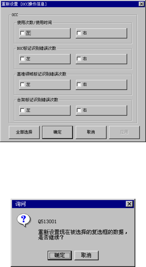 第 14 章 设备操作信息 14.2.7. 重新设置OCC操作信息 显示 OCC 操作信息画面时,在菜单栏中选择[数据]→[重新设置],或按下工具栏的[重新 设置]按钮后,显示如下的对话框。 图 14.2-12 重新设置 OCC 操作信息对话框 上述对话框画面列出了数据项目复选框。 选择需要重新设置数据项目的复选框, 按[确定] 或者[应用]按钮后,显示以下的对话框。 图 14.2-13 询问重新设置 OCC 操作信息对话框  按[确…
