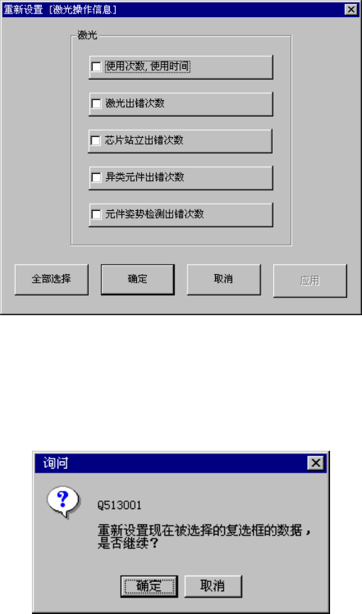 第 14 章 设备操作信息 14.2.12. 重新设置坏板标记操作信息 显示坏板标记操作信息画面时, 在菜单栏中选择[数据]→[重新设置], 或按下工具栏的[重 新设置]按钮后,显示如下的对话框。 图 14.2-21 重新设置坏板标记操作信息对话框  按上述对话框的[确定]按钮后,即可 重新设置 坏板标记操作信息全部数据。  按[取消]按钮后,不重新设置数据,依旧显示原数据。 14-35