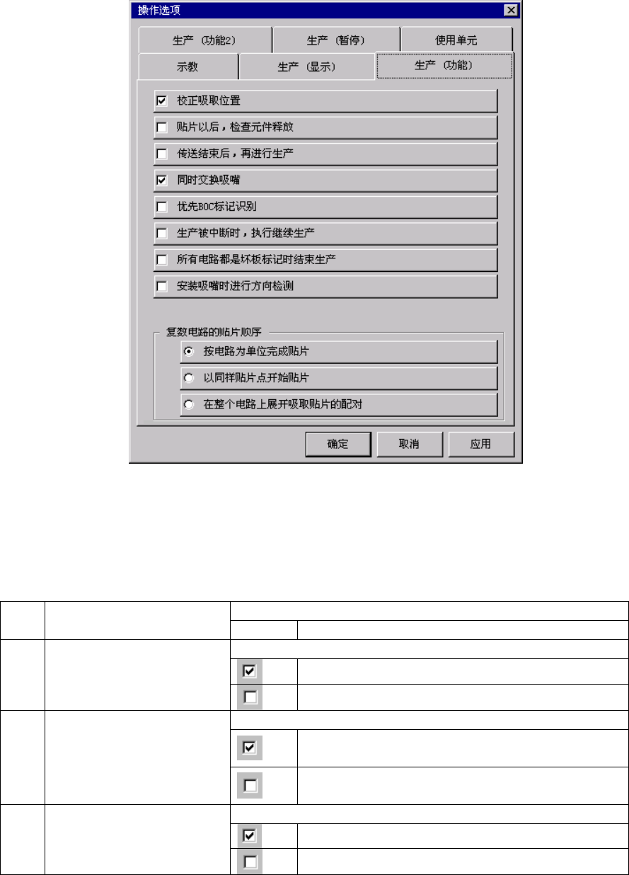 第 15 章 操作 选项 15-10 设置同时交换吸嘴。 实行同时交换。 4 同时交换吸嘴 不实行同时交换吸嘴。 设置优先识别 BOC 标记。 5 优先 BOC 标记识别 在识别坏板标记前先识别 BOC 标记。 生产异常终止时 (发生异步现象、 生产异常终止) , 无条件地生 成继续生产文件。 继续生产的操作步骤请参见[继续 生产] 。 6 生产被中断时,执行继续生 产 生产中断时生成继续生产文件。 生产异常结束时 (发生异步现象、 生…