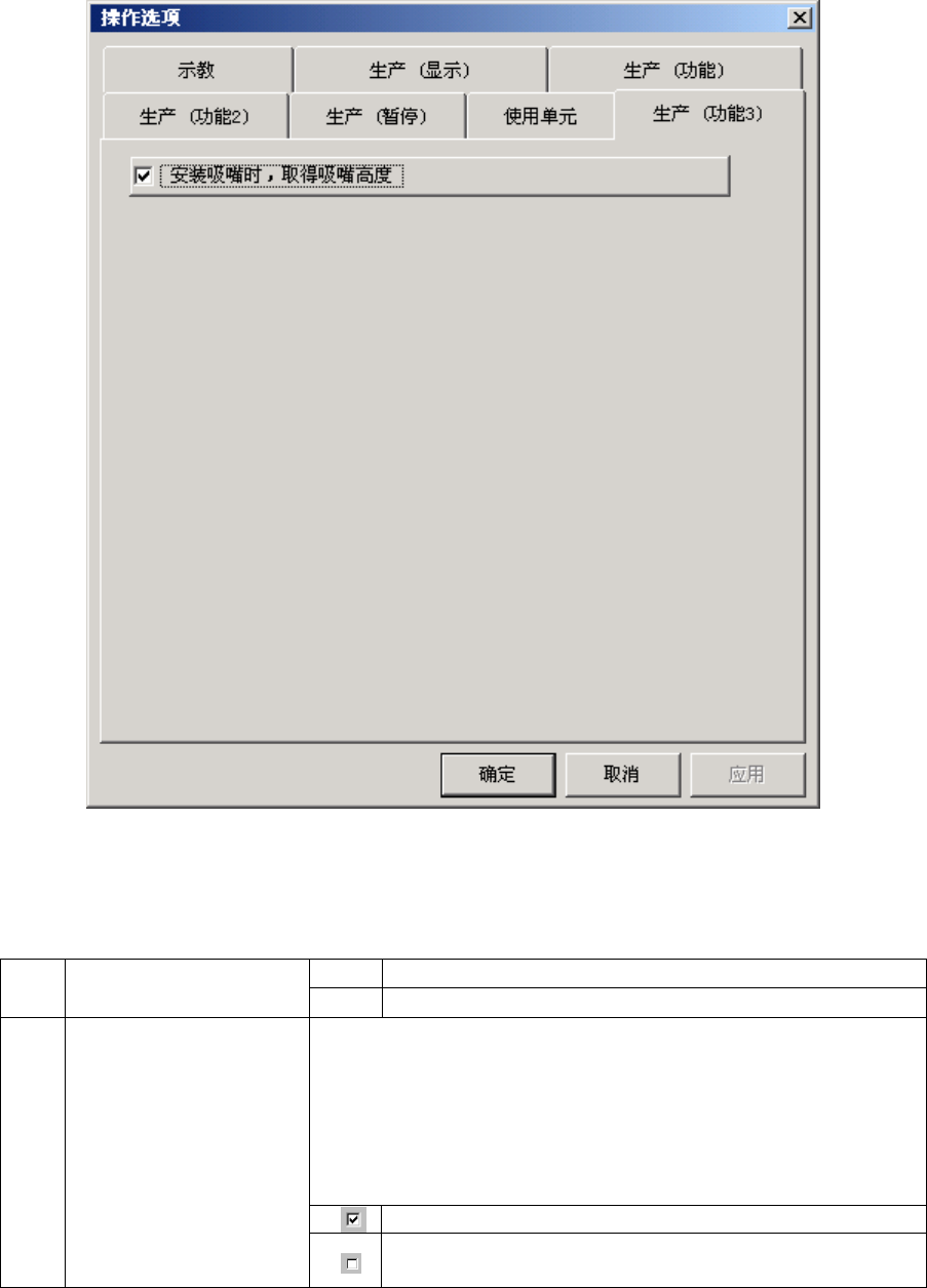 第 15 章 操作 选项 15-12 设置在基板传入/传出传送带的传送动作发生错误后生产再开 始时,是否要对基板传入/传出传送带有 无基板进行检查。 生产开始时不检查基板。 3 基板输入/输出传感器不进 行自动检查 生产开始时如果基板滞留在传感器之间,则自动反 映到传感器。 设置是否预备相同元件替代送料器。 元件用完以前不使用替代的送料器。 4 预备相同元件送料器 不使用替代的送料器。 设置在检查有无元件时发生真空错误的 情况下,是否执…