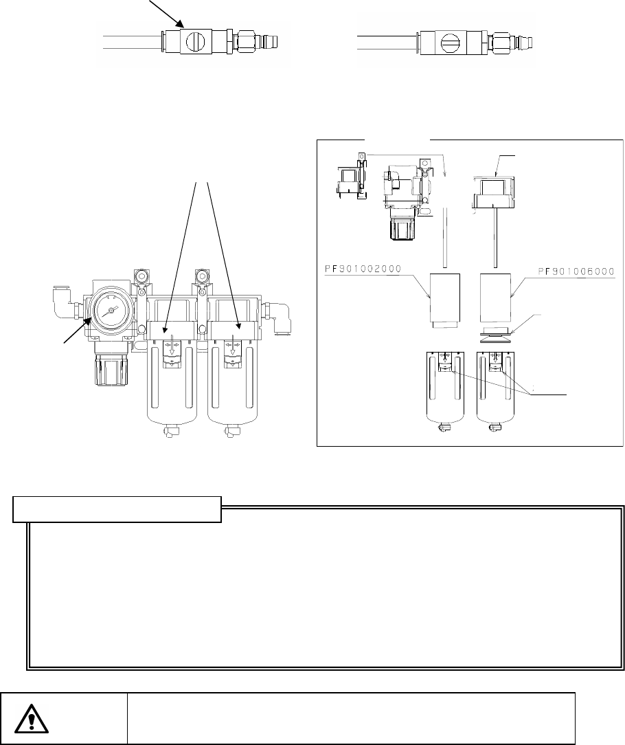 第 16 章 维护 16-2 16.2 各部的检查 16.2.1 气压 确认压力表的压力为 0.50 MPa 。 压力在 0.45 M Pa ~ 0.55 MP a 以外时,请确认漏气是否为厂方原因,如无异常,请按照以下 步骤,重新调整压力。 <主要压力的设置步骤> 1)打开管道旋钮①。 2)向下拉「调节旋钮②」 ,再旋转旋钮,把使用气压调整到 0.50 MPa。 图 16.2–1 排水阀和调节旋钮 图 16.2–2 滤芯 …