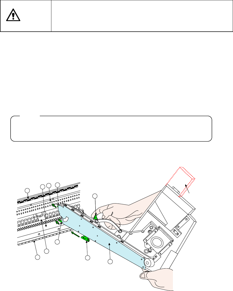 第 17 章 选项 元件的使用 17.1.4 更换管状送料器 注意 当 XY 轴或贴片头正在运行时更换送料器,可能使管状送料器碰到运行中的 元件,危及人身或损坏装置。 XY 轴和贴片头正在运行时,请绝对不要更换管状送料器。 此外,请一定要在打开安全盖之后再进行更换工作。 (1)安装步骤 1) 将「管状送料器①」的底面放到「送料器台架②」上。 2) 滑动 「管状送料器①」 , 以 「安装板 B ⑦」 作为导板, 对准管状送料器底面 的导板…